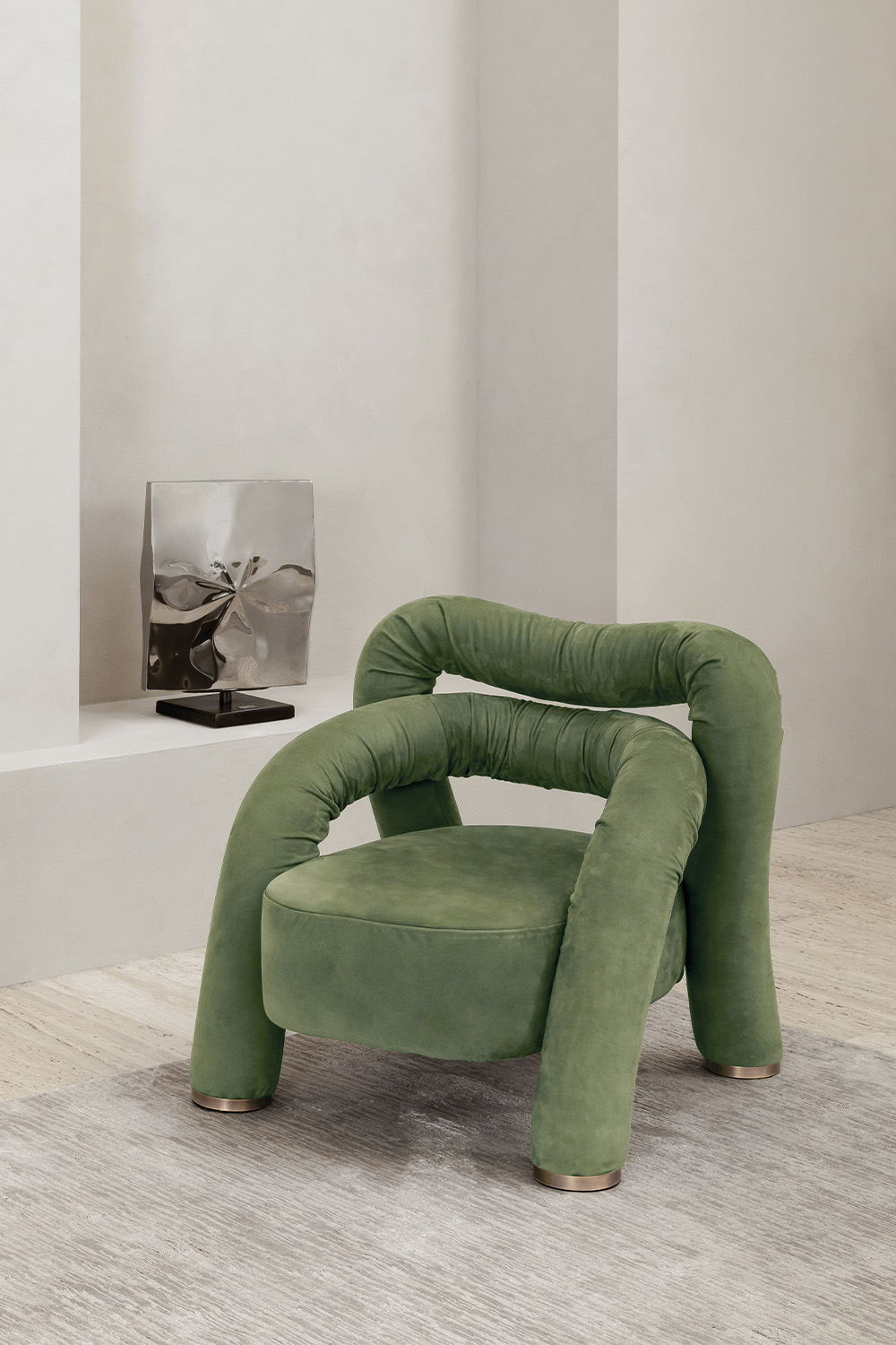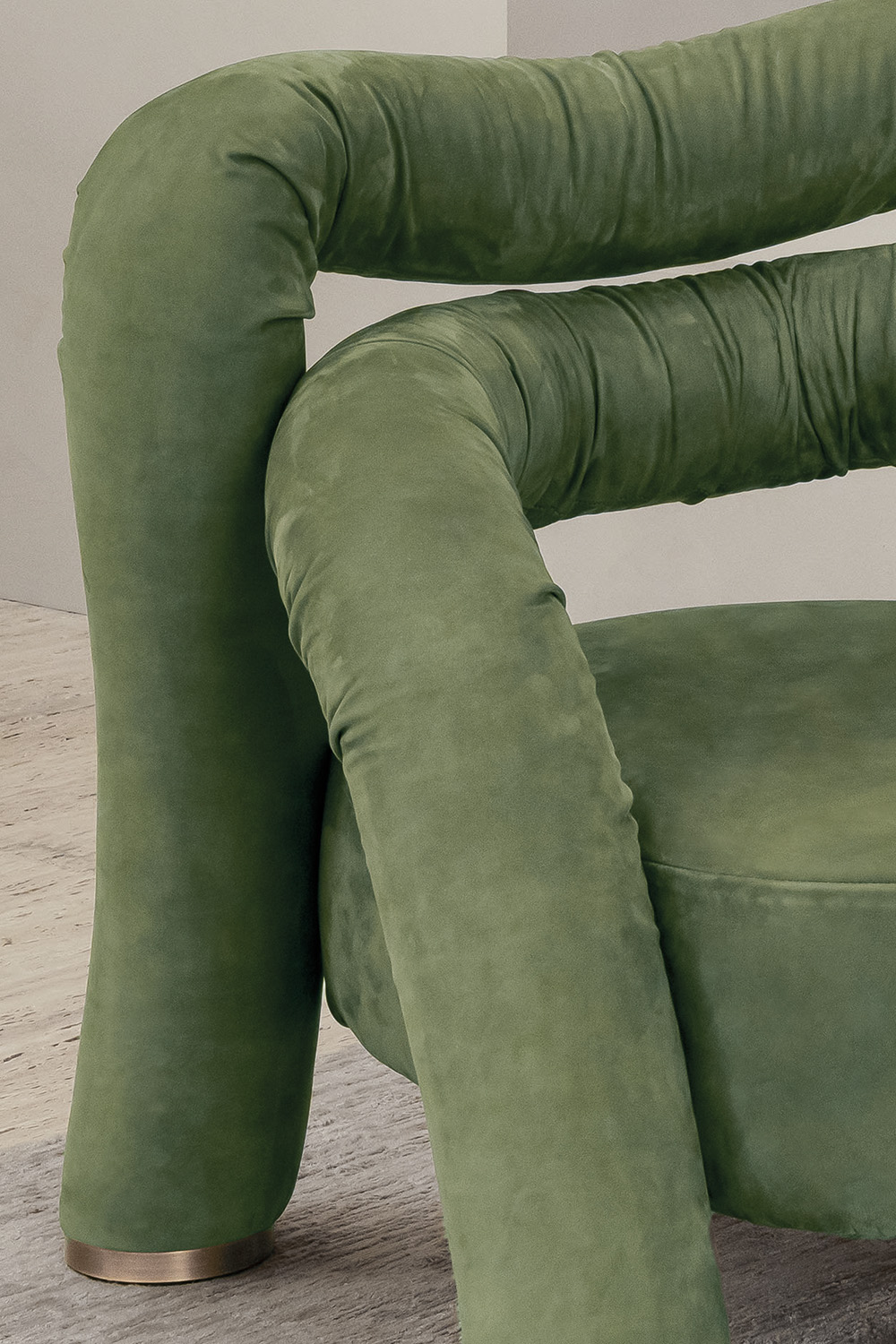 Abbraccio interprets the iconic gesture of the collection in a more intimate scale, transforming the armrests and backrest into a single fluid movement that naturally wraps around the body. Its soft, organic silhouette evokes the idea of a protective embrace, defining a harmonious volume that blends intimacy with a subtle scenic presence. The contained proportions make it a versatile piece, ideal for sophisticated lounge areas, refined dining settings, or contract spaces requiring personality and character.