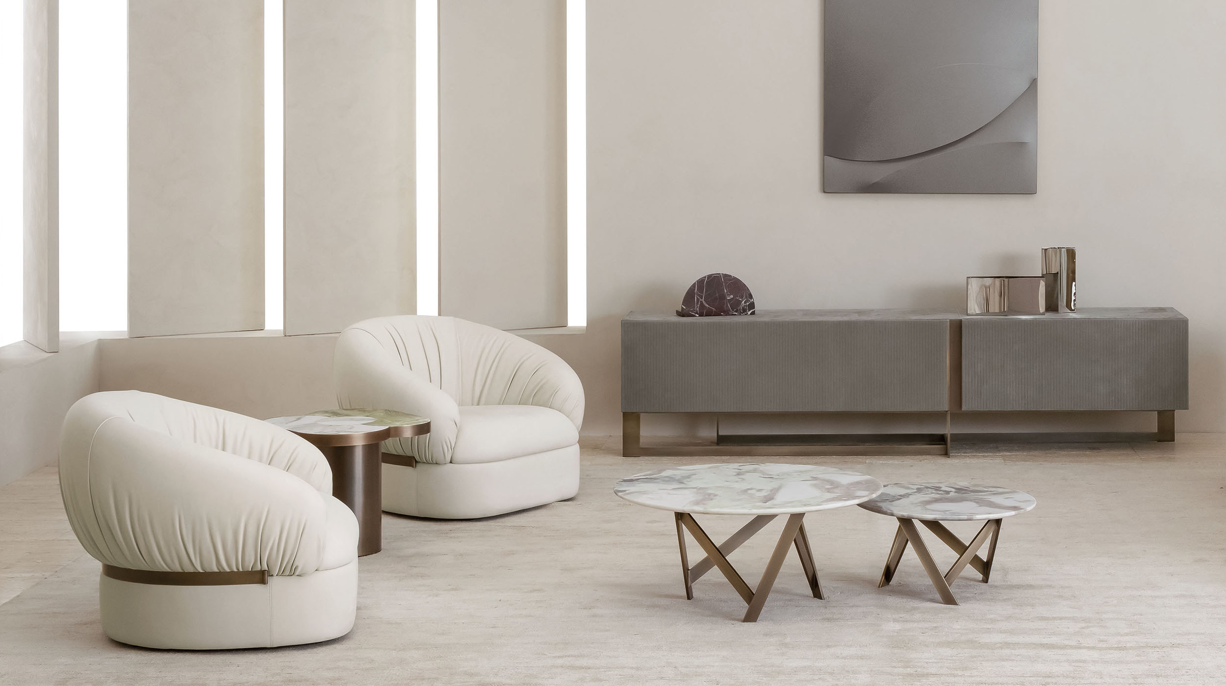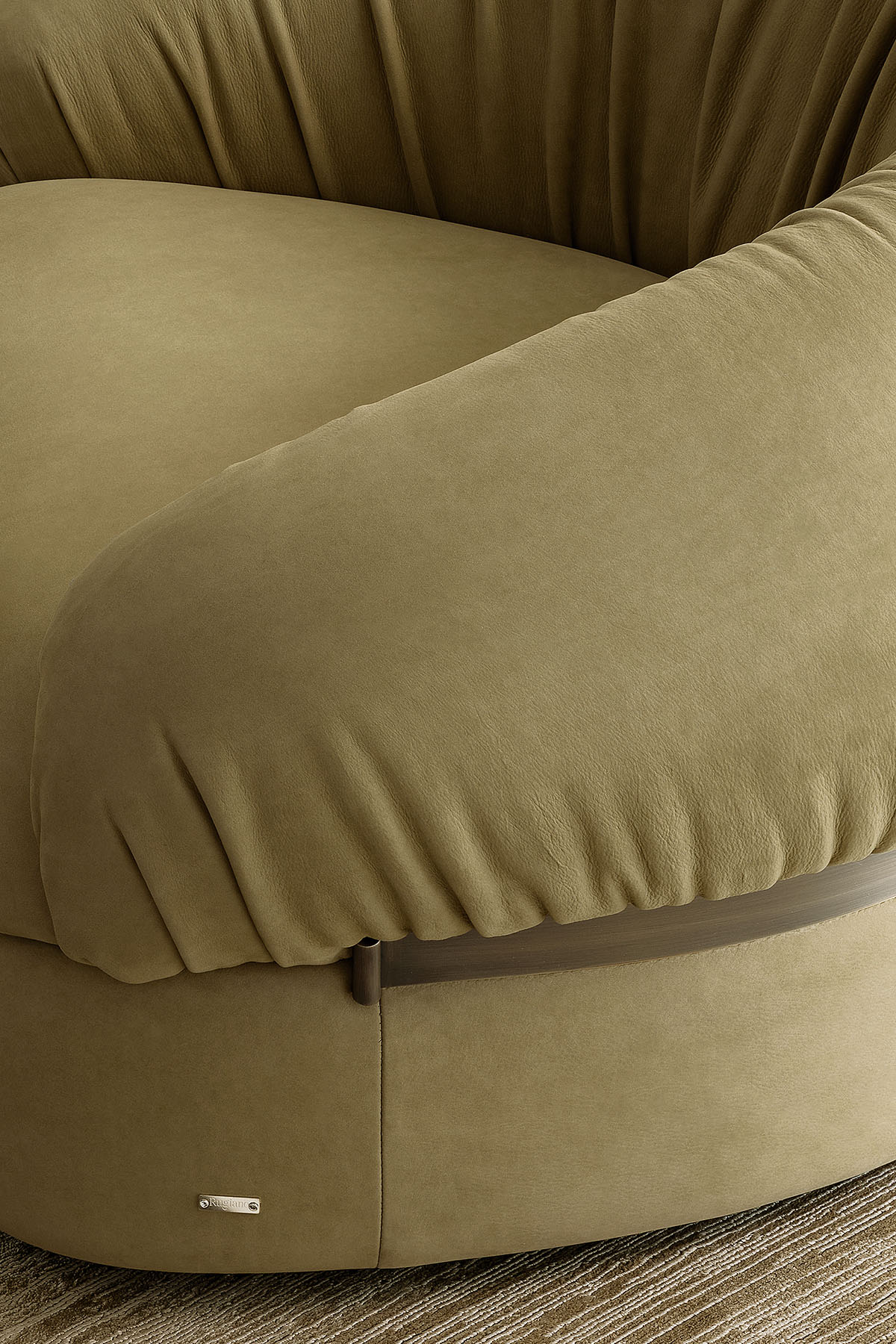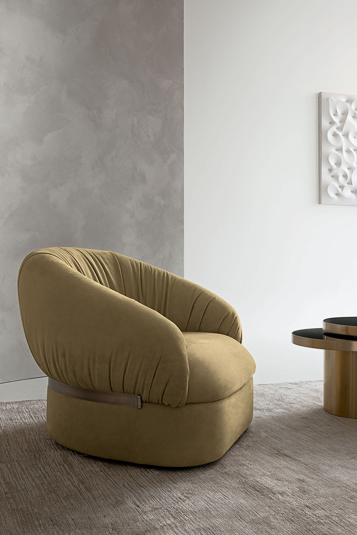 Generous, well-balanced padded surfaces stand out for the rhythm of gentle tensions and draped details that animate the upholstery, creating a refined tactile and visual effect. The rounded, compact silhouette supports the seat with an equilibrium of softness and design rigor, while every curve conveys the idea of contemporary, warm, sophisticated relaxation.