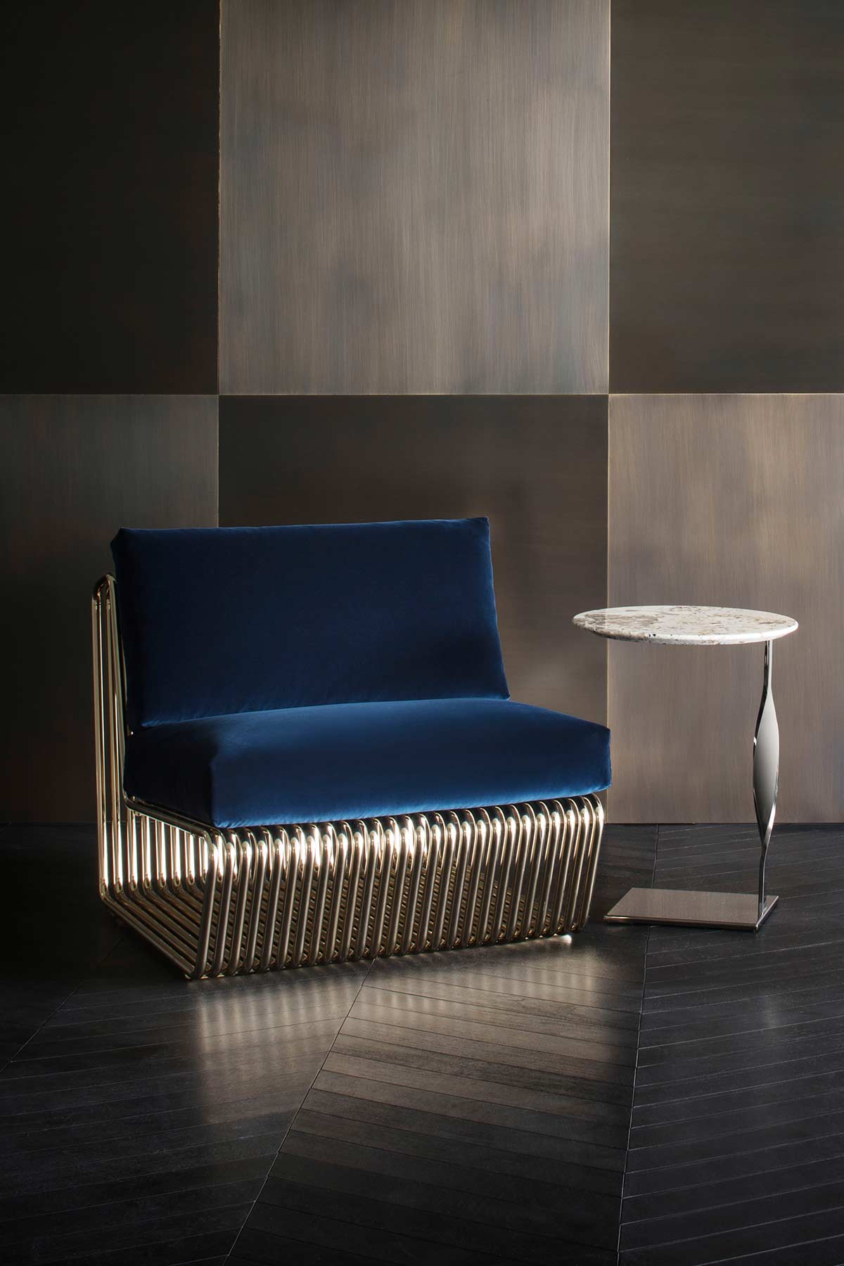 The name identifies the main design trait, a sinuous and continuous shape. The infinity concept is also recurrent in the glossy gold or dark chrome hand-finished components of the structure, which constantly repeat to create an unique, sculptures-like piec