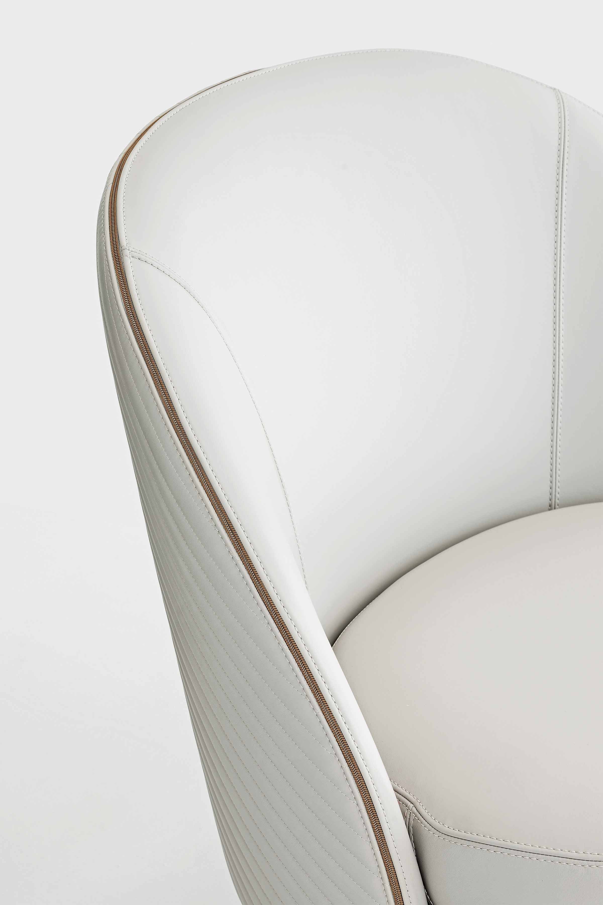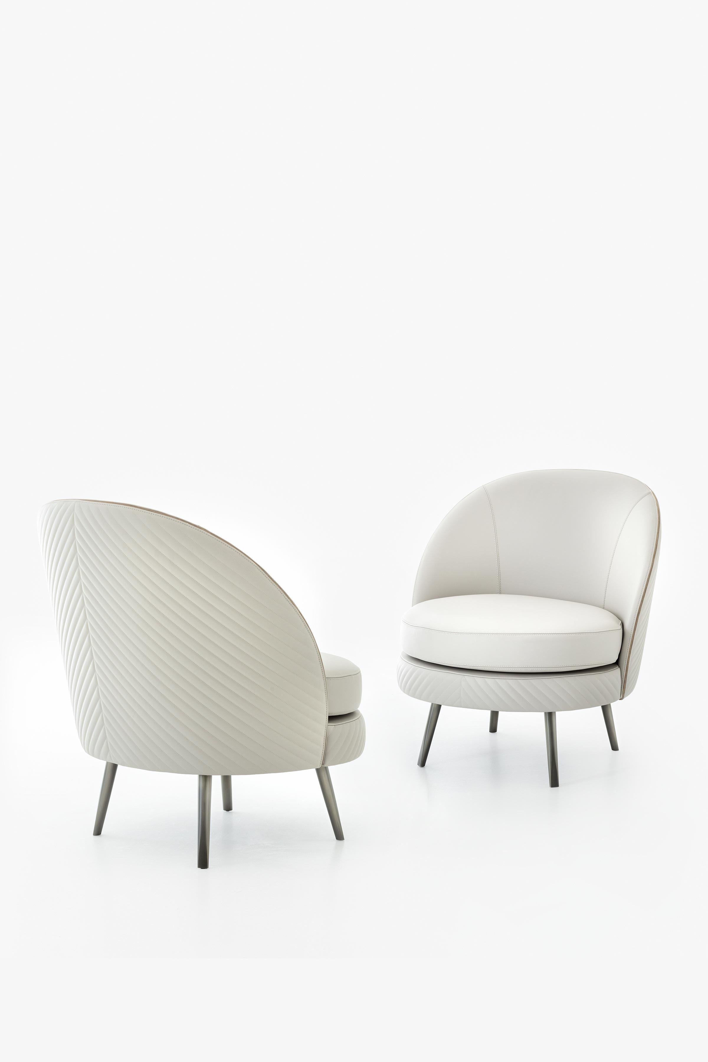 Upholstered armchair. Outer surface available plain or with patterned stitching. Metal feet.