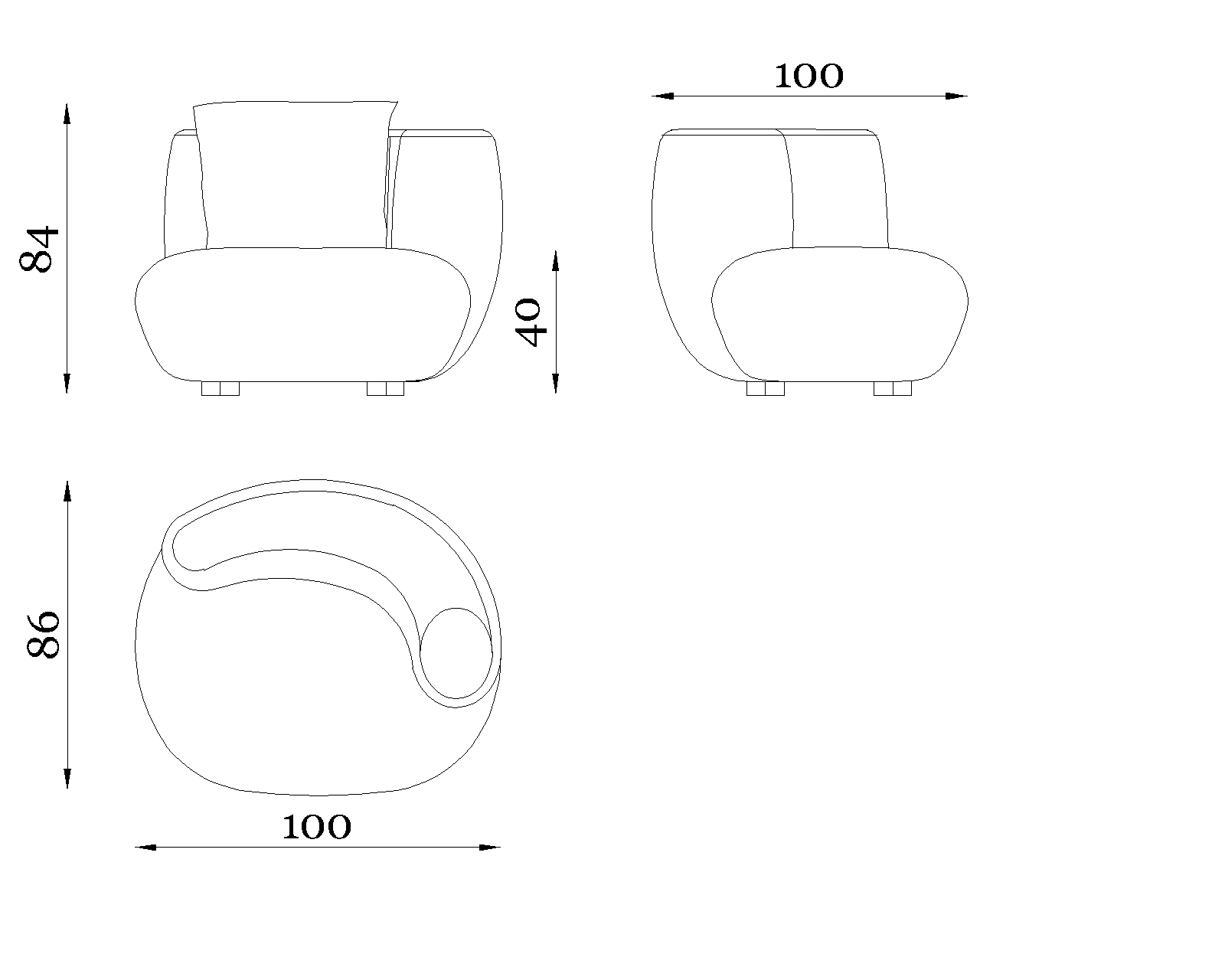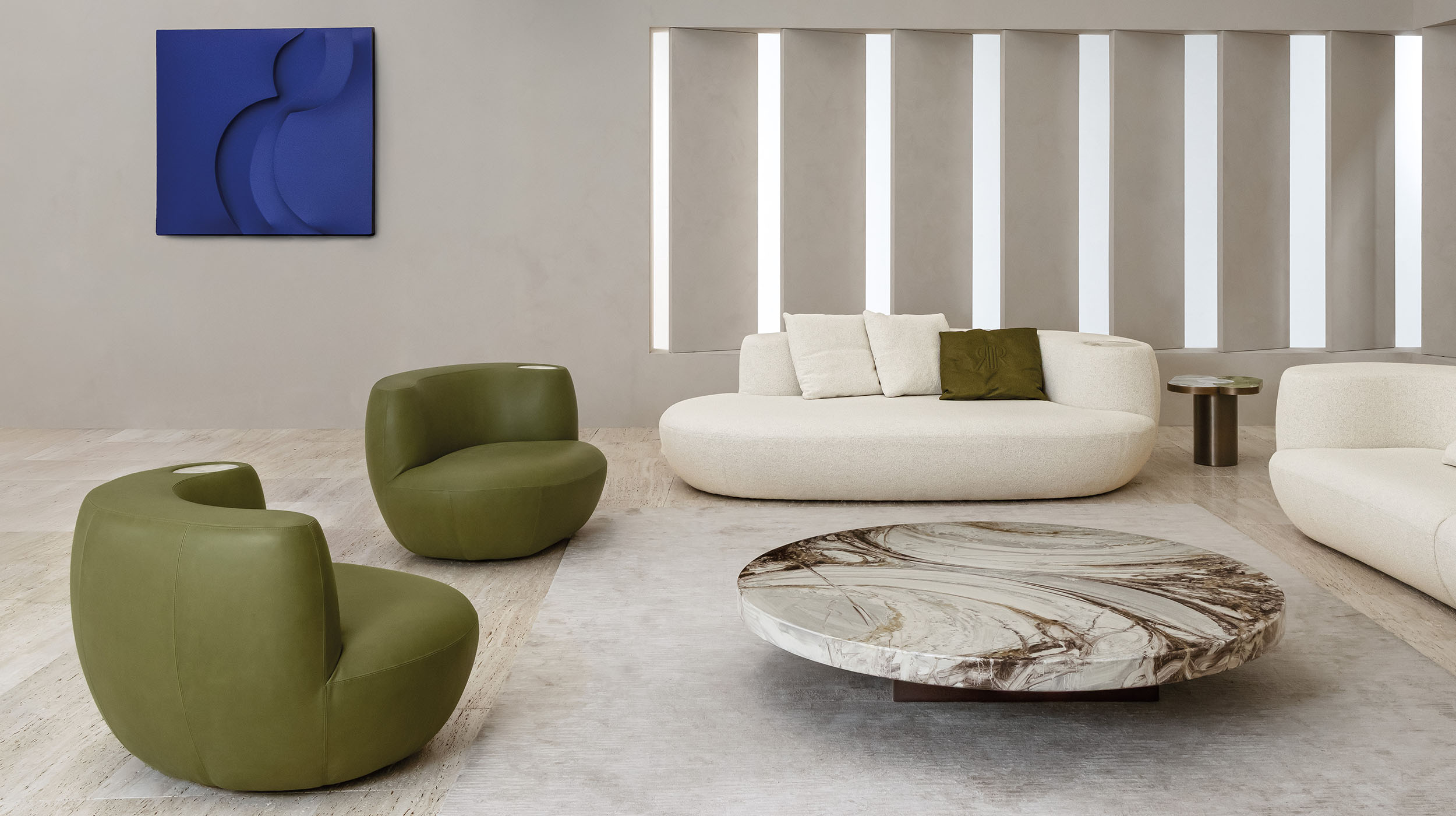 Soft lines and generous volumes shape the Rafael armchair, a statement piece designed to combine formal elegance with ultimate comfort. The curved, enveloping silhouette defines a bold and contemporary style, ideal for enhancing high-end living, lounge, or hospitality spaces.