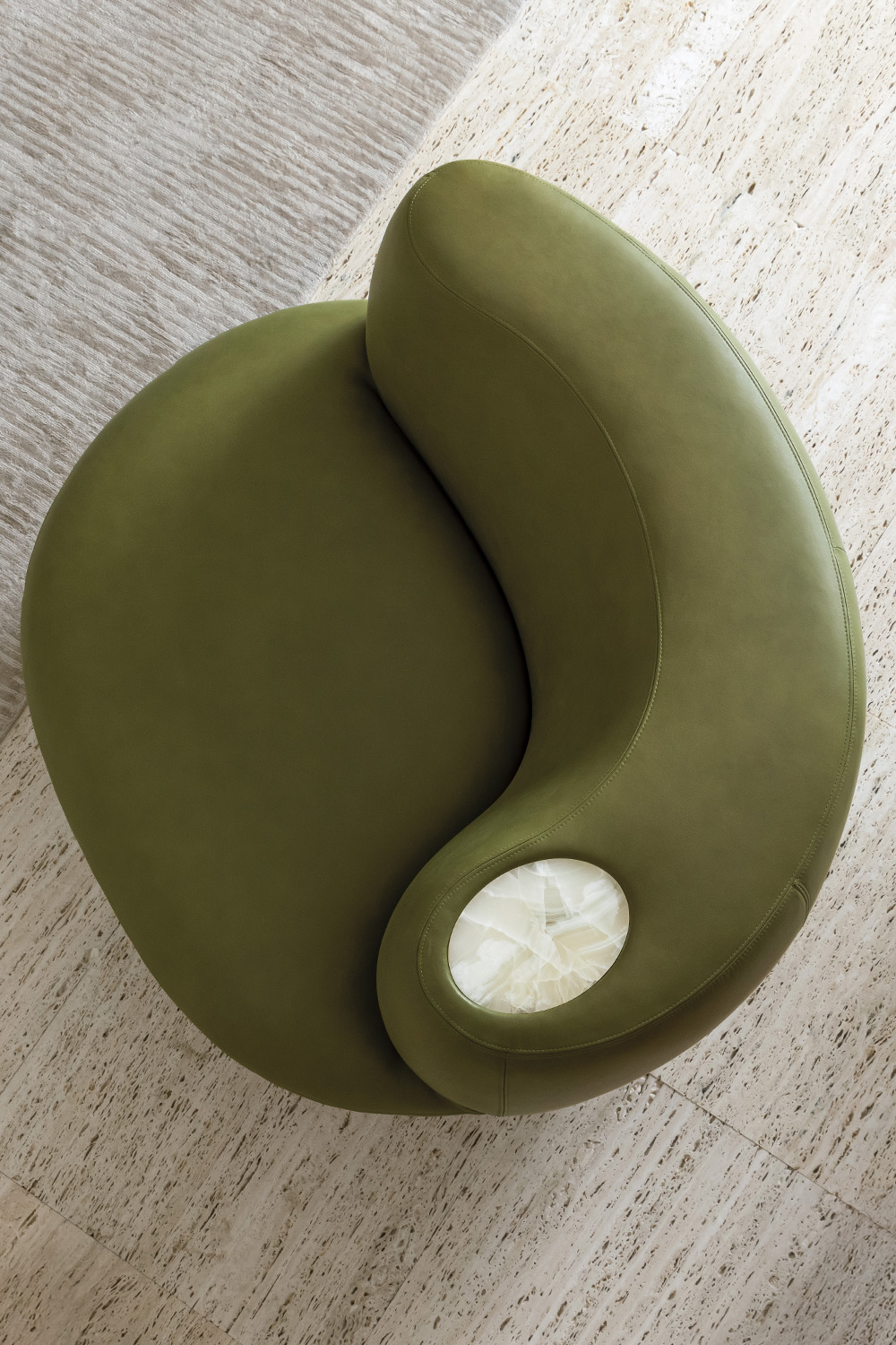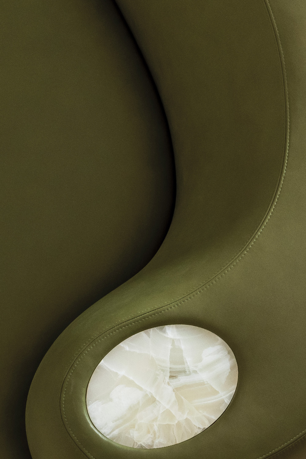 Fully upholstered in leather or fabric, Rafael stands out for its perfect balance between aesthetics and functionality, with proportions designed to offer a relaxed yet compact seat. The most iconic feature is the natural marble insert integrated into the backrest—a precious material element that enriches the structure, adding uniqueness and prestige.