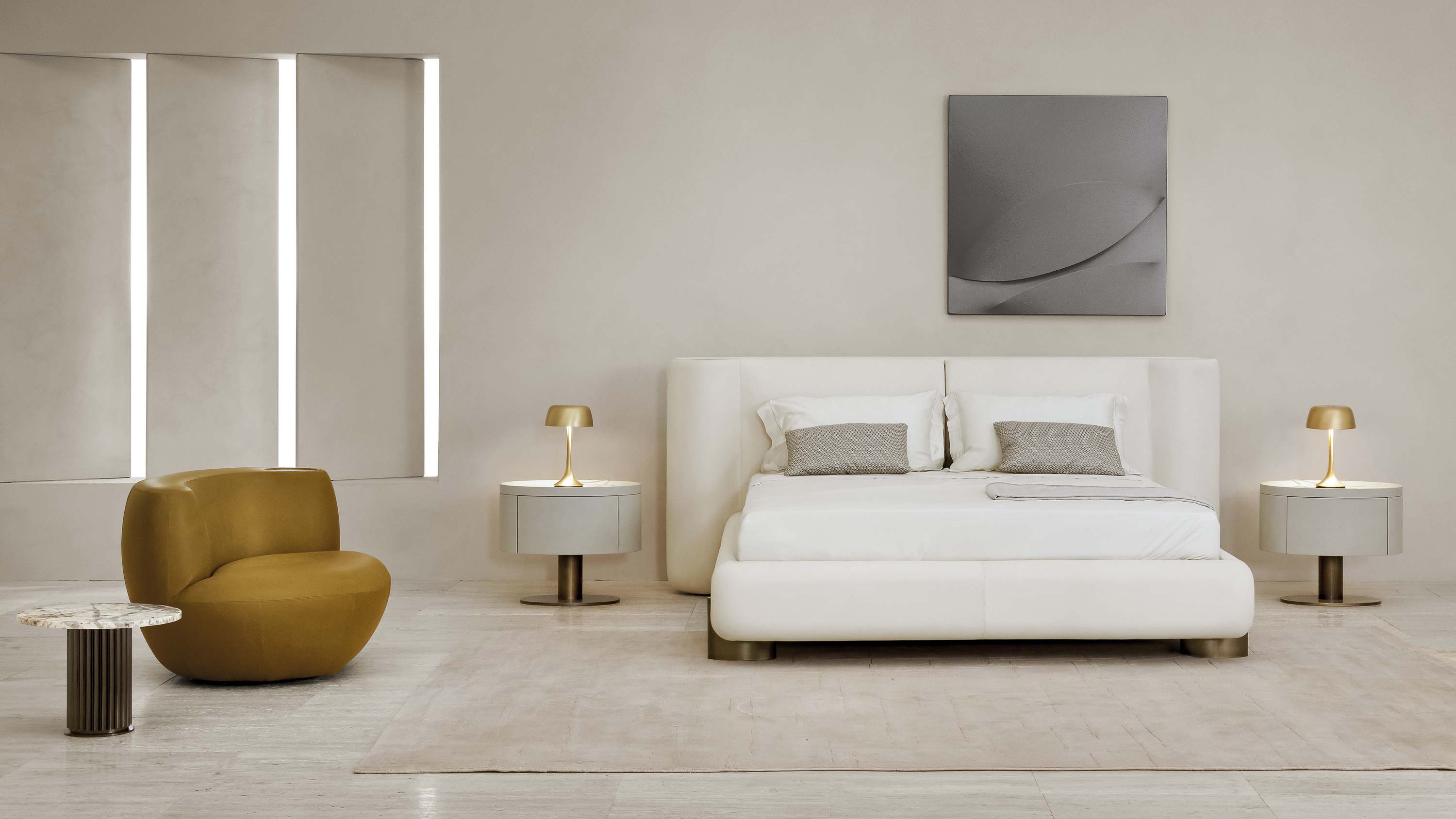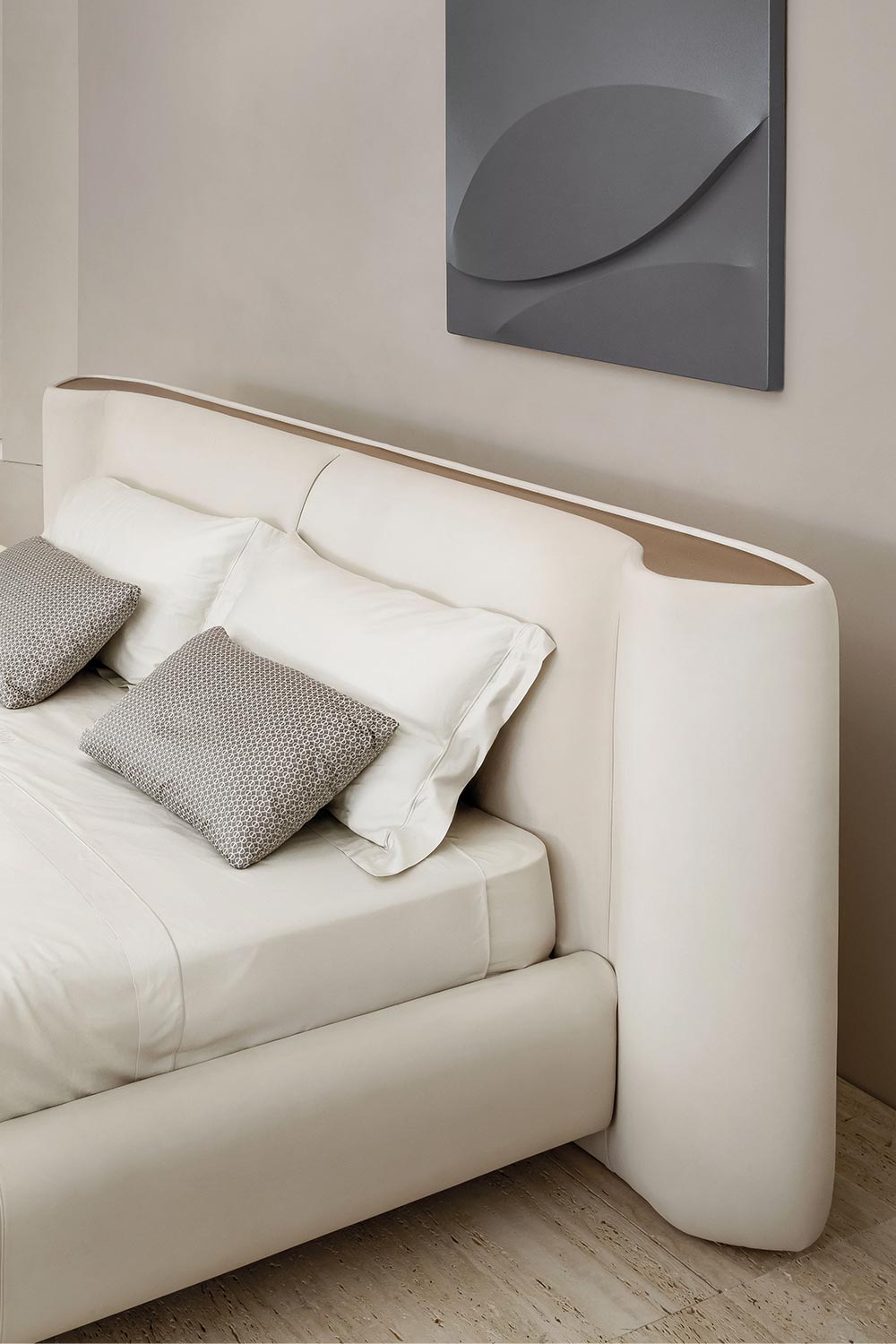 Soft lines and generous proportions define the Anais bed—a creation that expresses comfort through a sculptural and sophisticated presence. The headboard, featuring a gently curved and padded silhouette, extends laterally in a fluid, protective gesture, evoking a sense of intimacy and welcome. A distinctive detail is the upper insert in bronze, which serves as an integrated shelf, merging aesthetic value and practical function in a seamless design element.