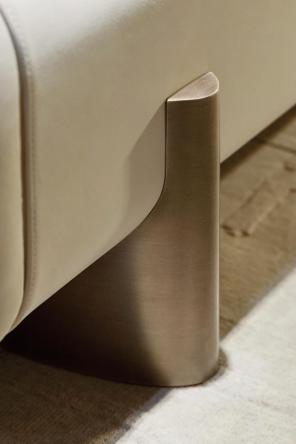 The fully upholstered structure is supported by sculptural bronze feet, adding a precious and cohesive material accent. Anais is designed for refined bedroom interiors, where every detail contributes to a warm, relaxed, and harmonious atmosphere. The interplay of full volumes, tactile materials, and tailored craftsmanship turns Anais into a discreet yet characterful centrepiece.
