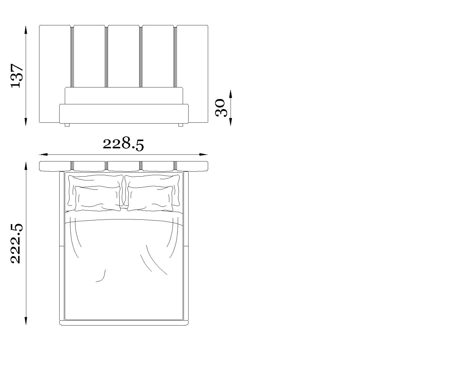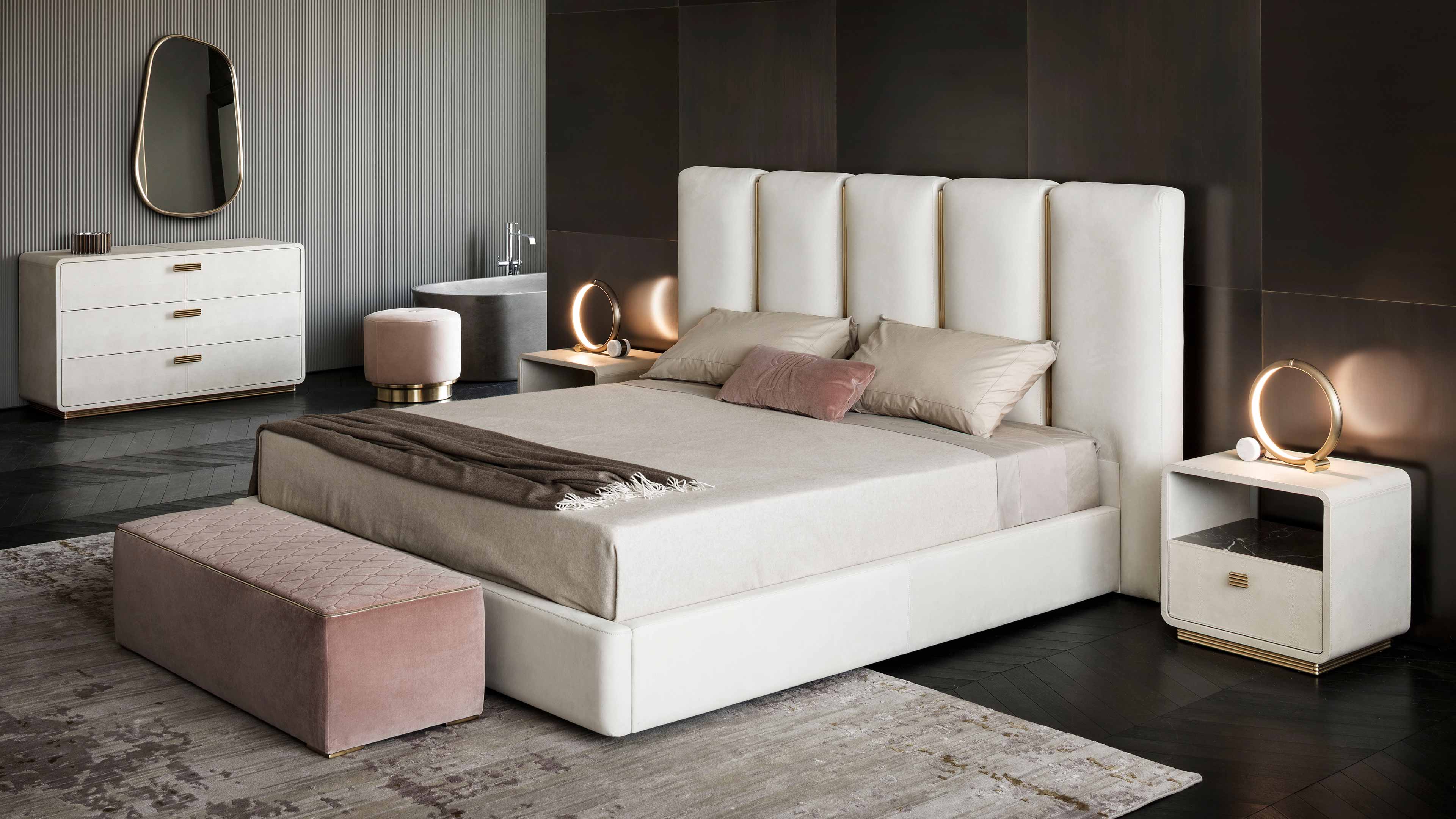 The Club bed is defined by its imposing upholstered headboard, articulated into vertical panels that create an architectural rhythm both elegant and distinctive. The soft surfaces, upholstered in fine materials, are punctuated by refined metallic inserts that add brightness and emphasize the harmony of proportions.