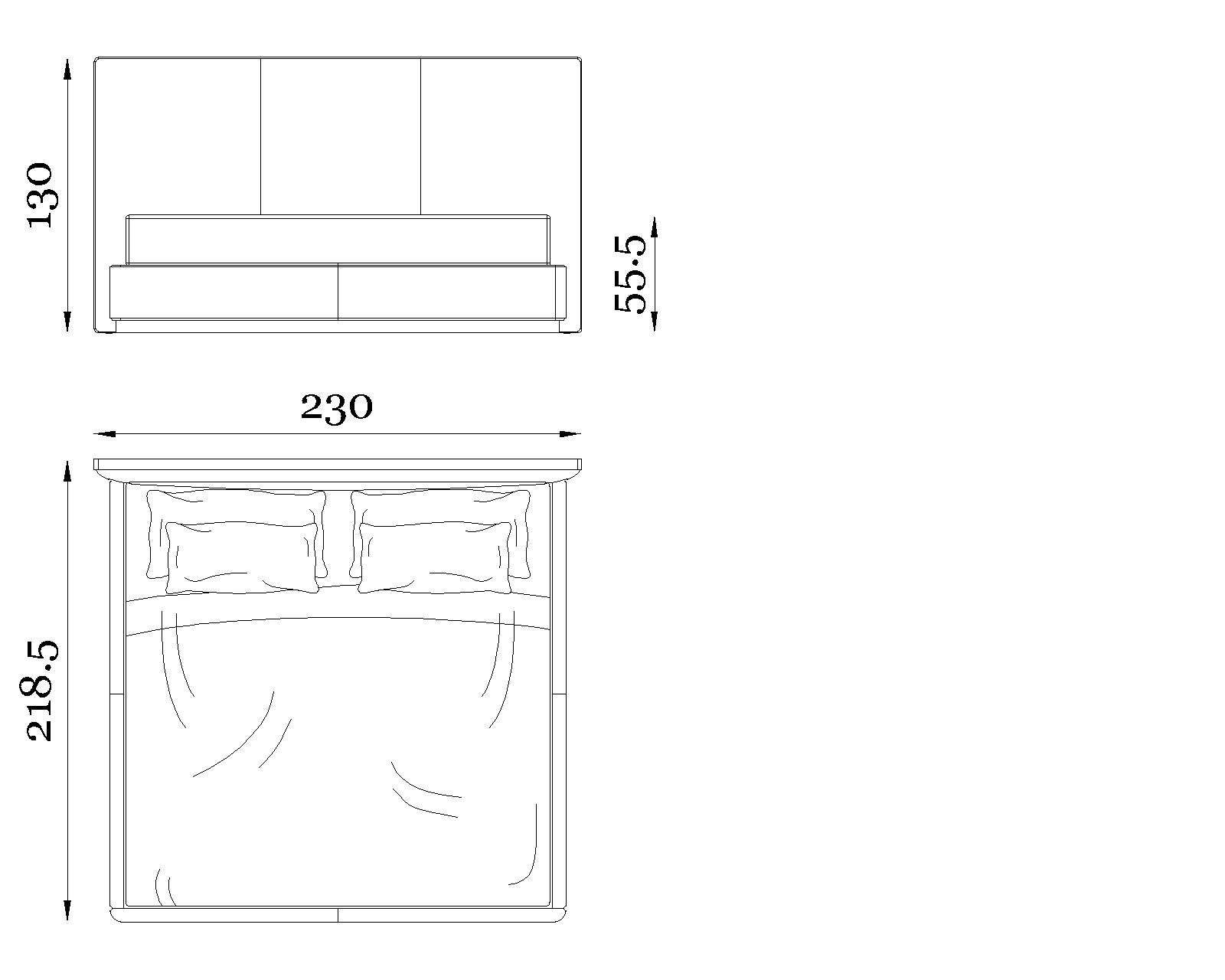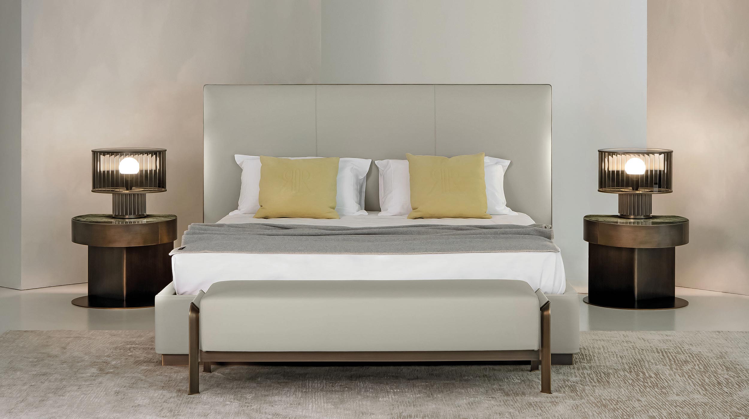 The large upholstered headboard thus becomes the absolute protagonist, defined by balanced proportions and an elegant presence that transforms the wall into a backdrop of discreet and refined luxury. A bronze insert embellishes the structure, while the matching bronze feet complete the design with continuity and sophistication.