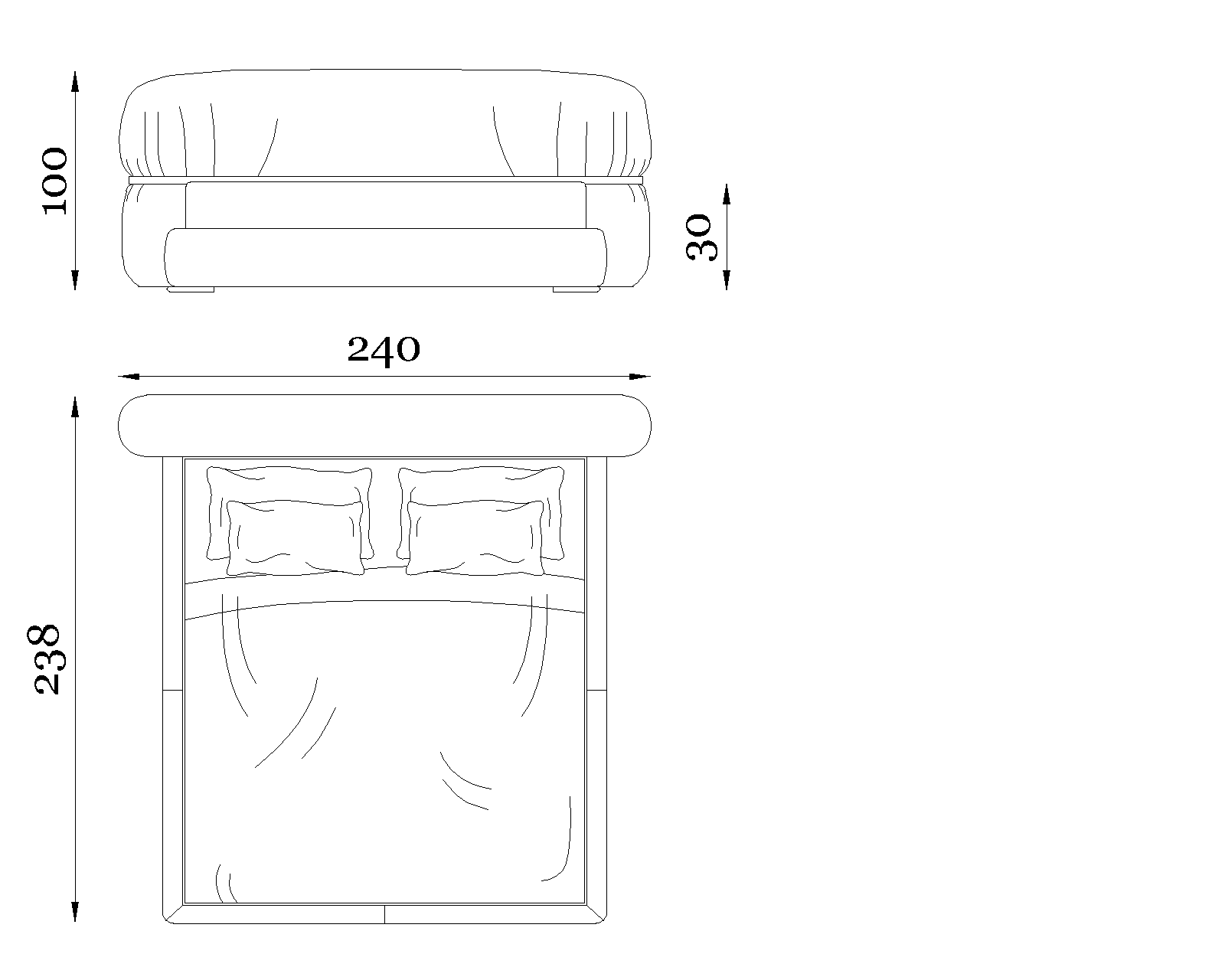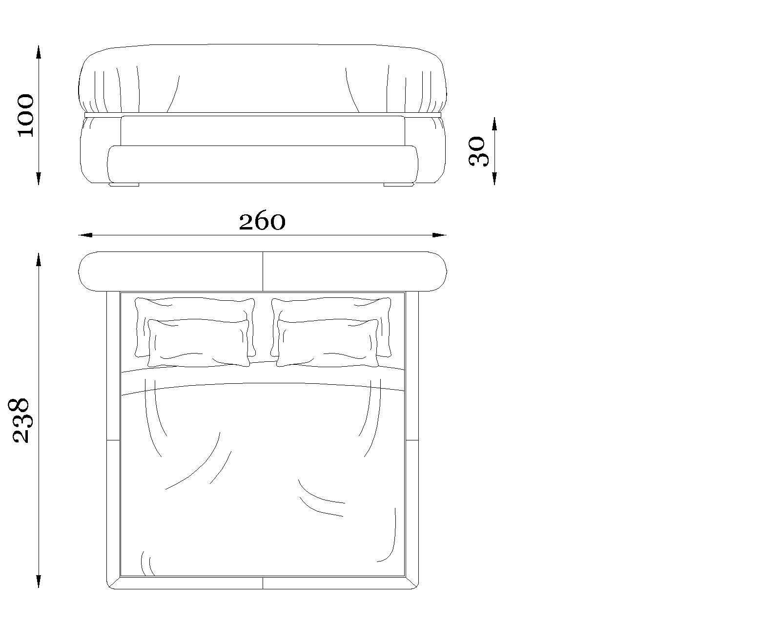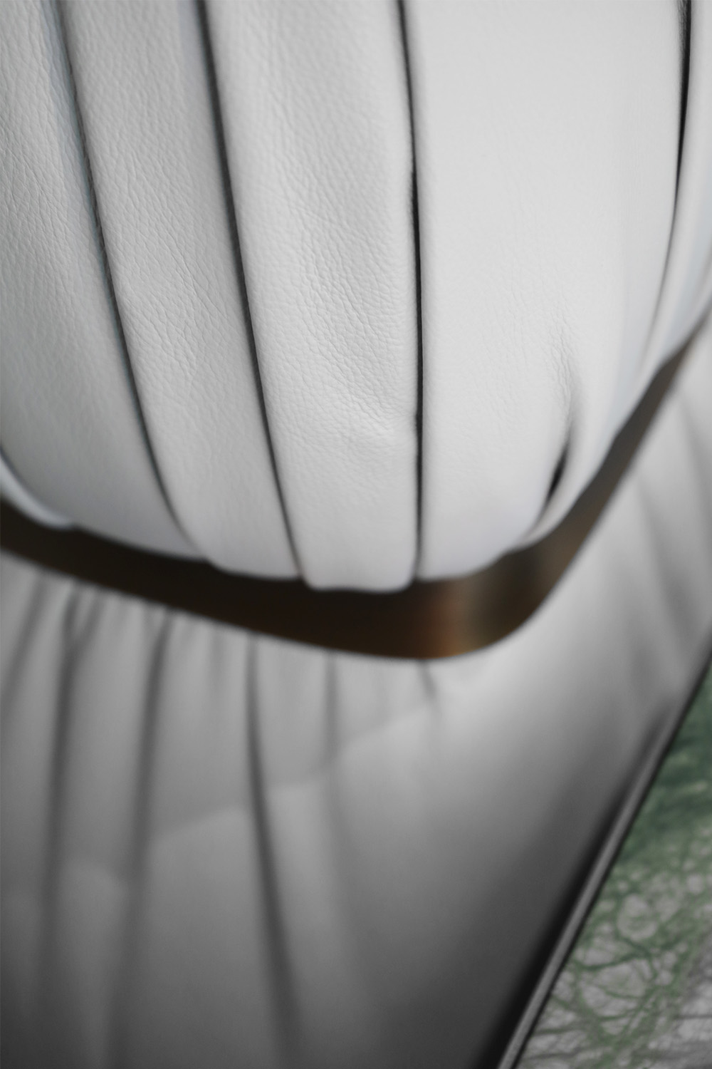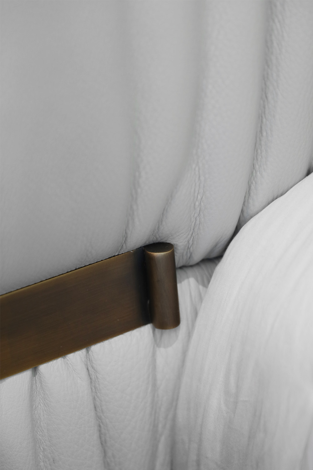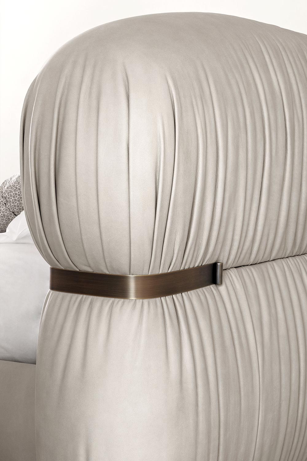 The rounded, fully upholstered bed frame merges seamlessly with the headboard, creating a cohesive and sophisticated silhouette. A bronze detail, delicately positioned on the sides, acts as a refined focal point, subtly highlighting the decorative identity of the piece with a touch of light and materiality.