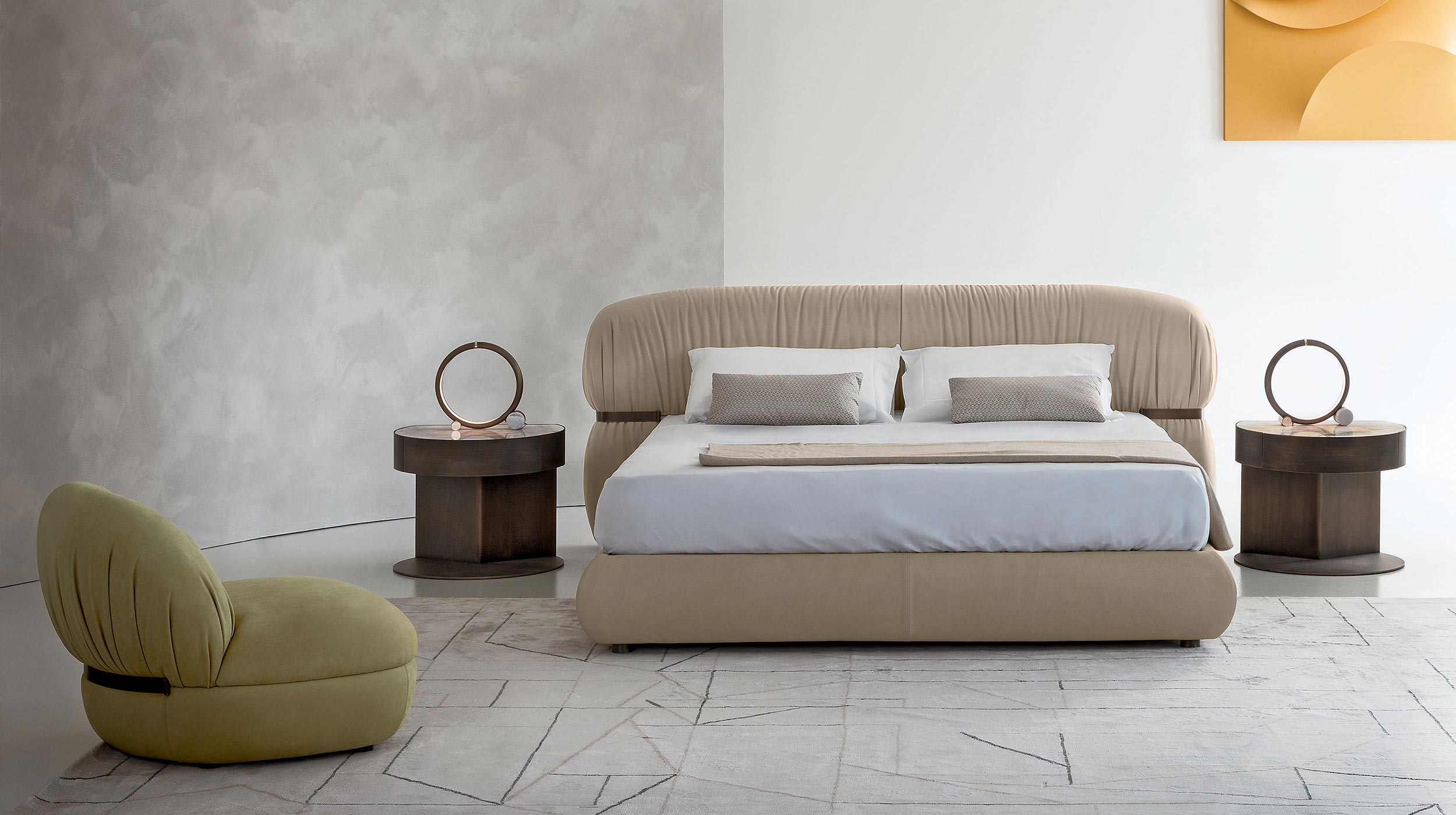 The Fandango bed reinterprets the night area through generous volumes and balanced proportions, featuring a statement headboard — soft, enveloping, and richly upholstered — enhanced by an irregular draping that adds movement and personality to the design. The fluid texture of the cover opens into natural folds, evoking sartorial gestures and the informal elegance of a bespoke garment.