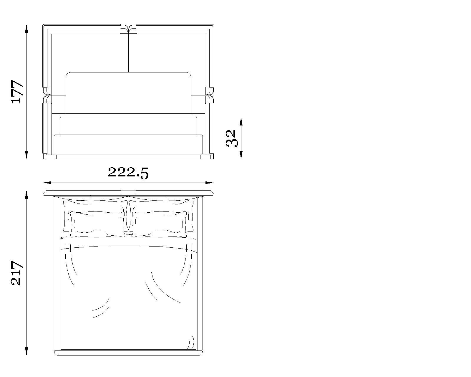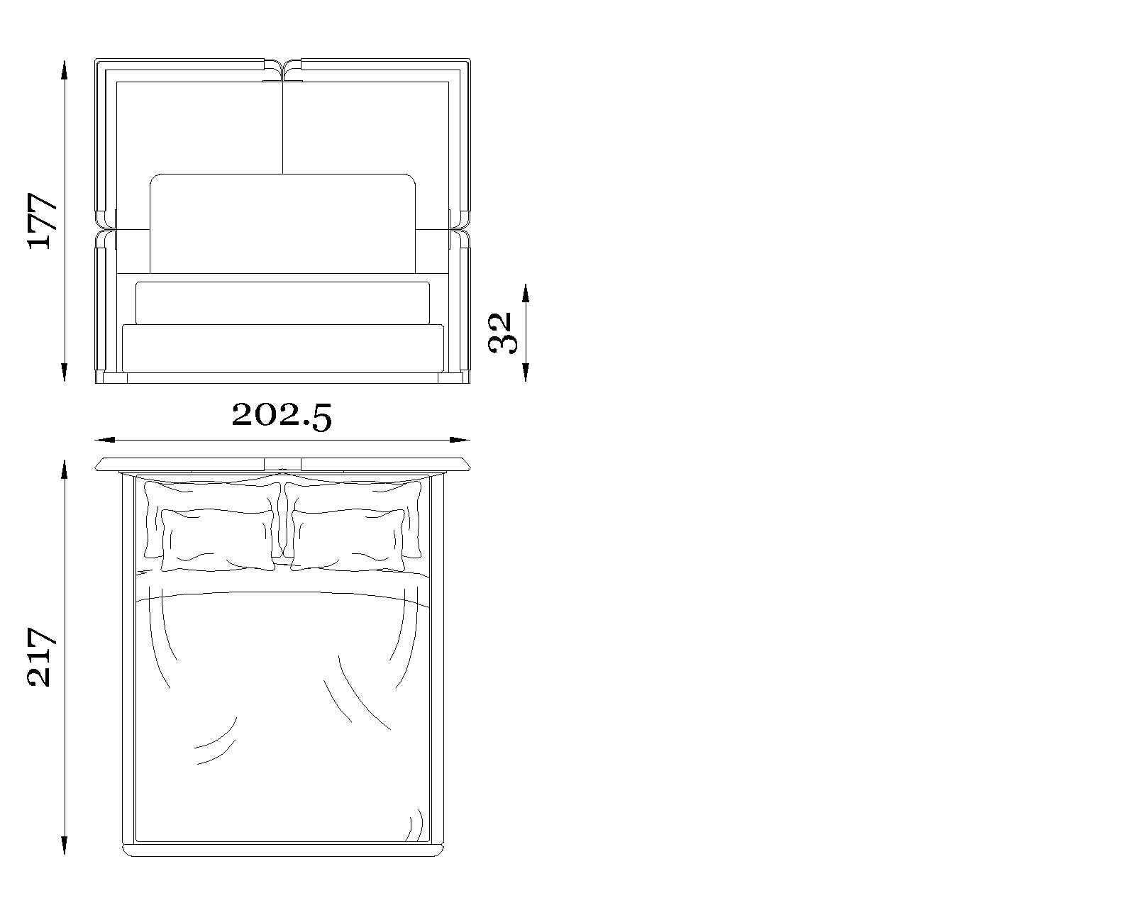 The bedframe, also fully upholstered, ensures visual continuity and formal cohesion: the whole becomes a harmonious volume, enveloping yet structured, without compromising on technical refinement or scenic presence within the bedroom space.