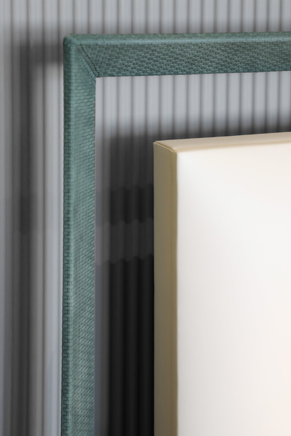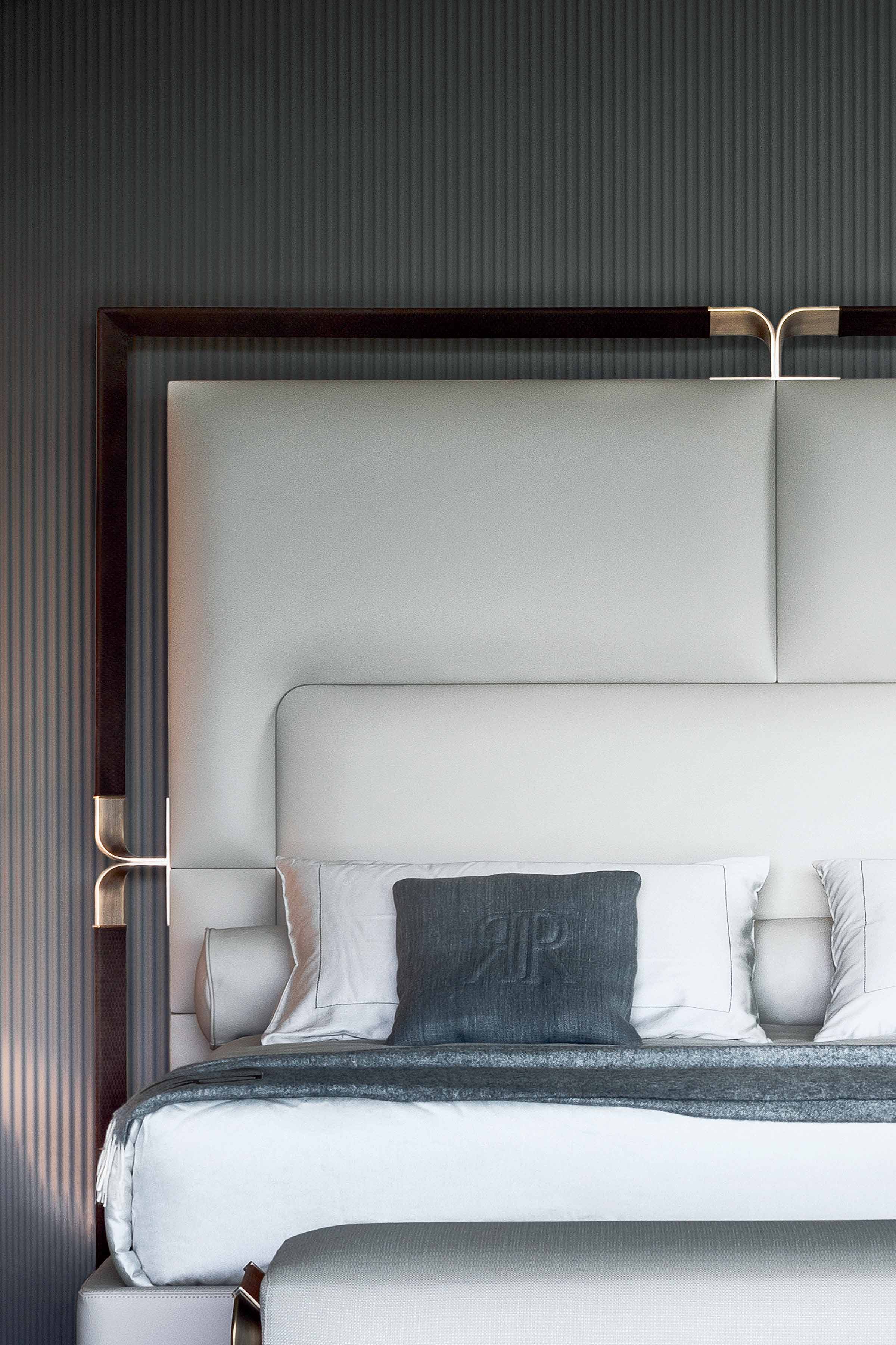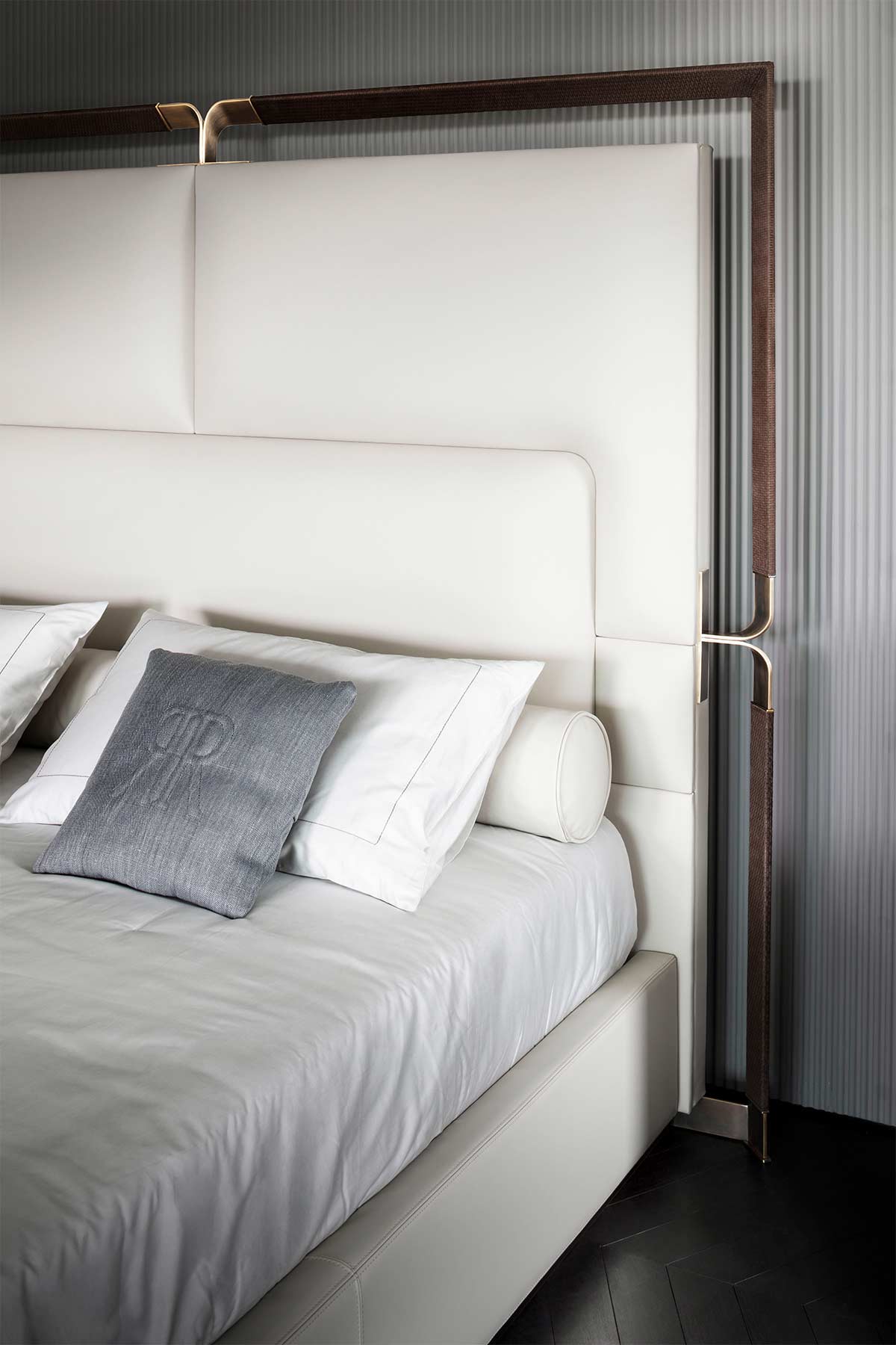 Grace conveys an intense elegance through well-calibrated proportions and distinctive details: the wide, generous upholstered headboard is framed by a metal profile covered in smooth or embossed leather, highlighting its linearity and affirming the structure as a statement of strong identity.