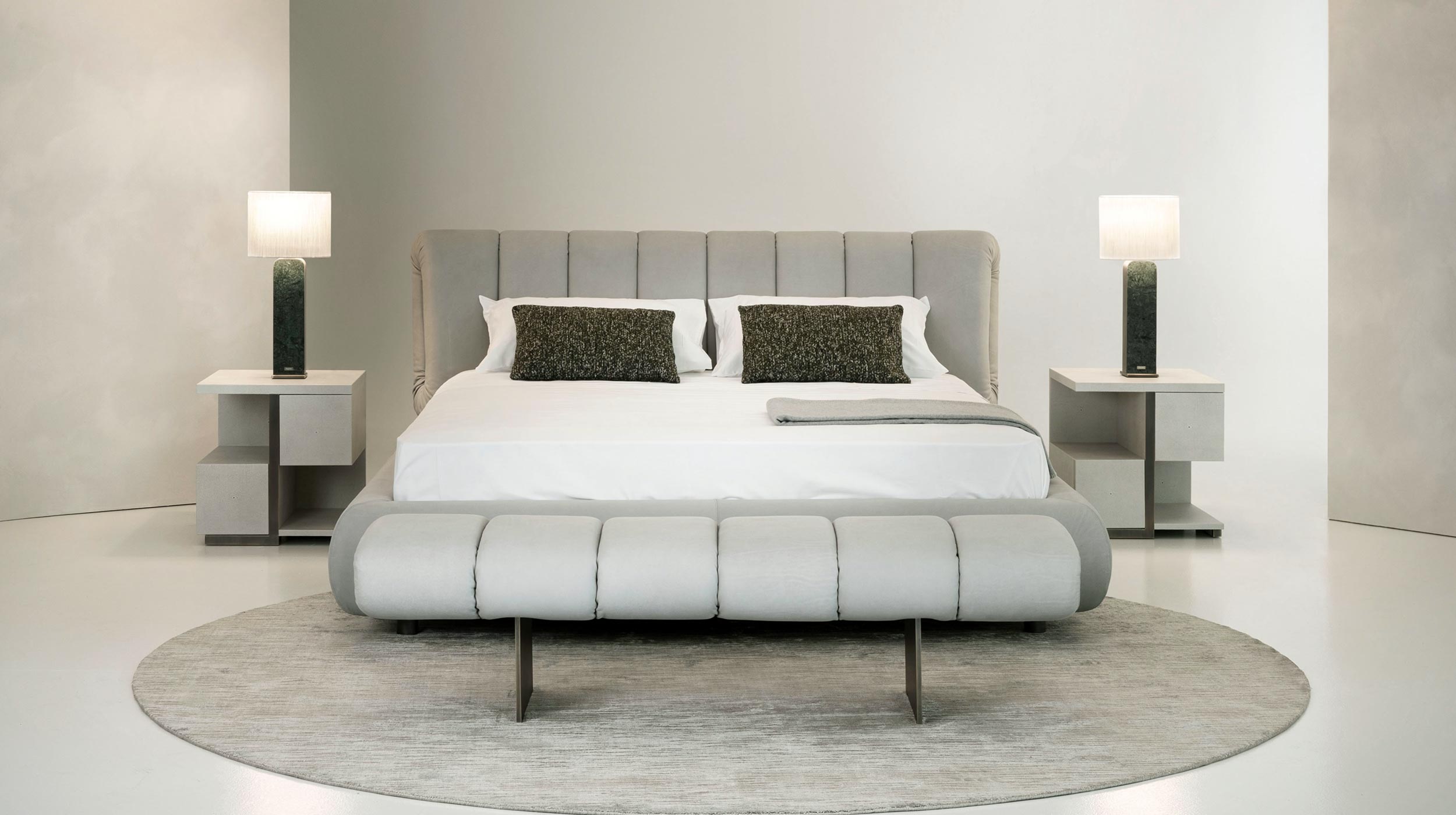 The headboard takes center stage — upholstered, enveloping, and visually modeled — capturing the light and animating shadows in a continuous interplay. The bedframe, integrated with balance, grounds the composition with a solid yet elegant presence, contributing to the overall aesthetic language.
