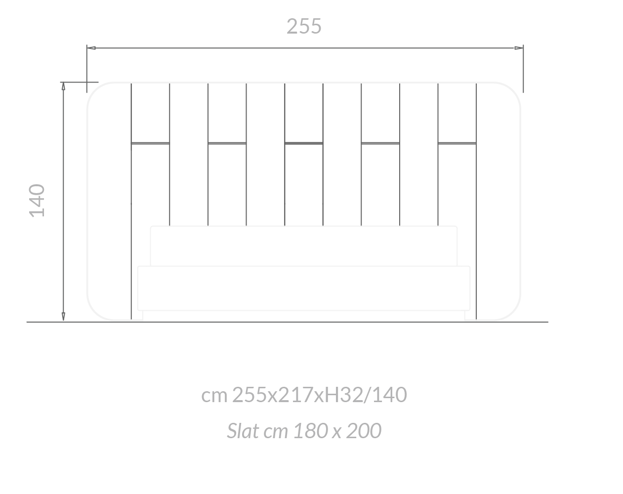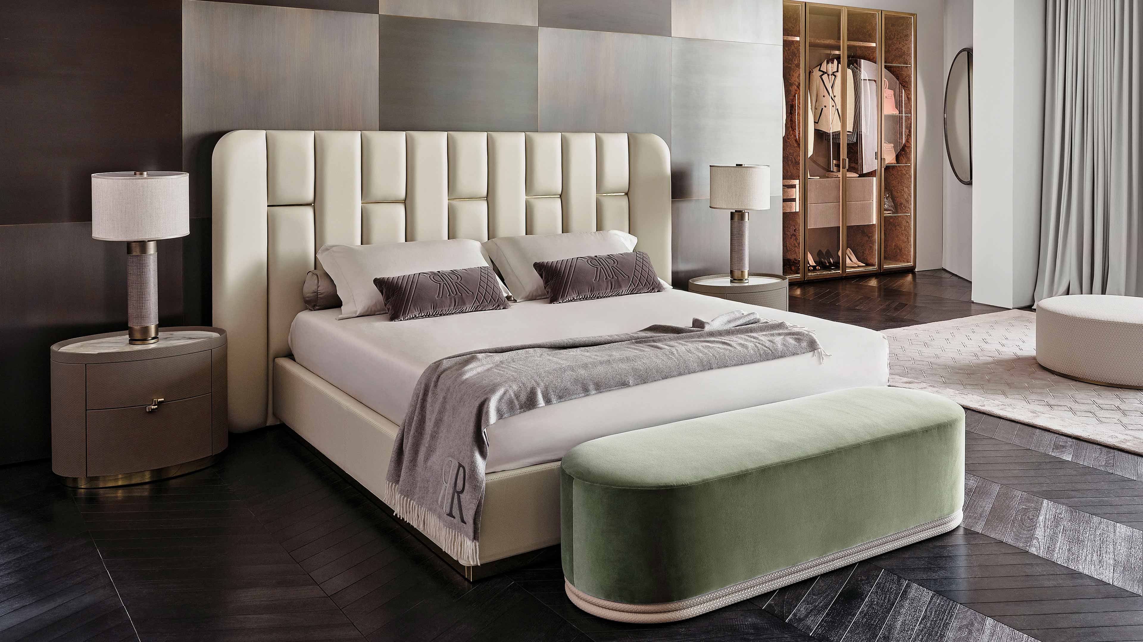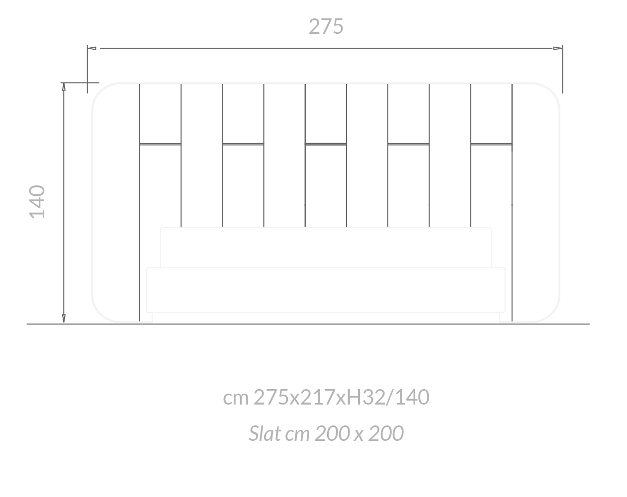 Padded and upholstered headboard with a geometric design. Metal details padded and upholstered bed-frame.