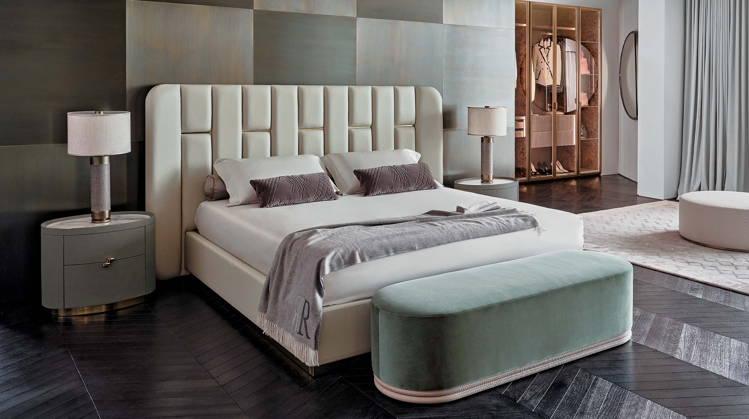 The upholstery, available in fine leather or fabric, stands out for its impeccable tailoring and the metallic accents that highlight the vertical geometry of the design. Every element, from the headboard to the bed frame, is conceived to express enveloping comfort and understated luxury — hallmarks of the Rugiano aesthetic.