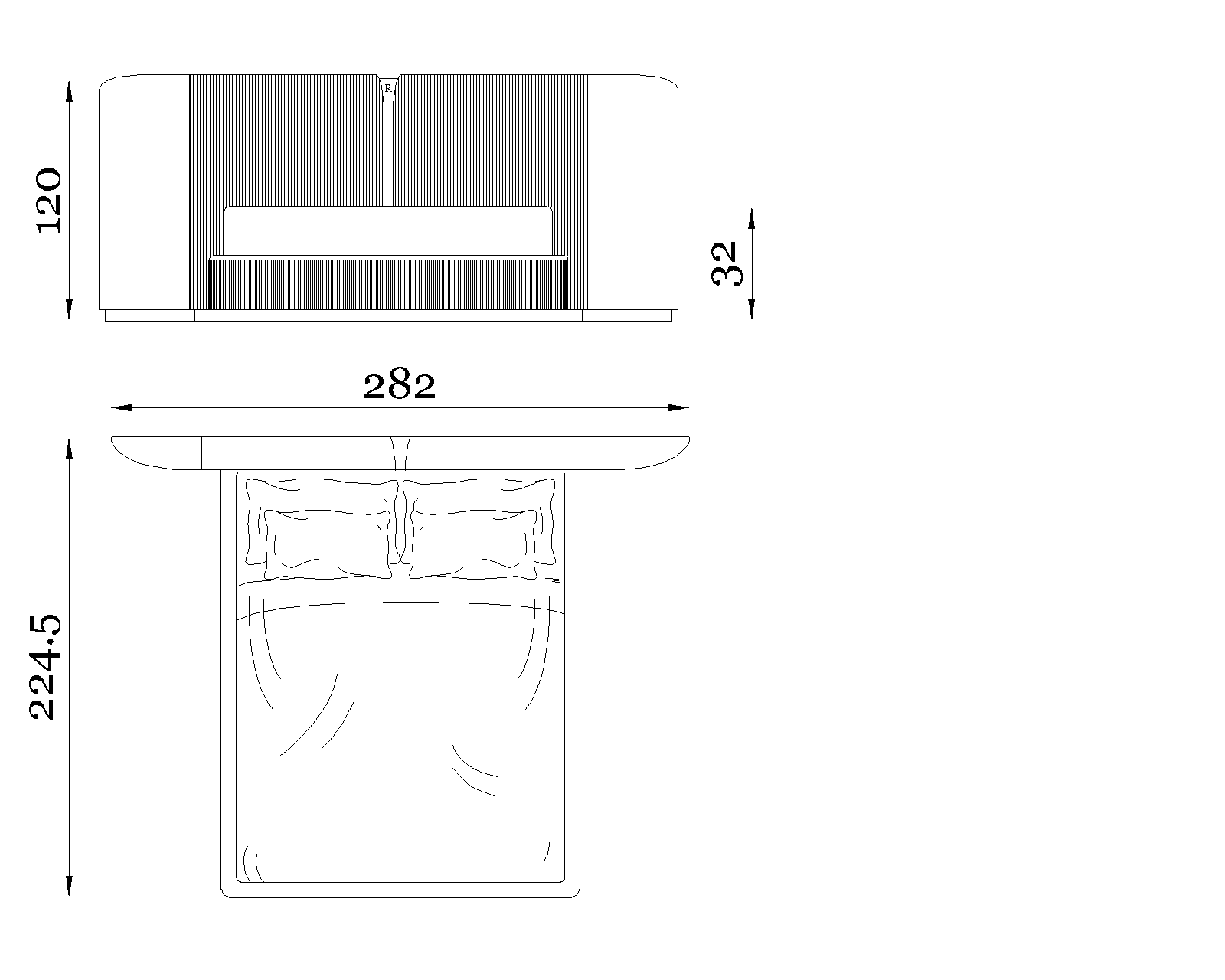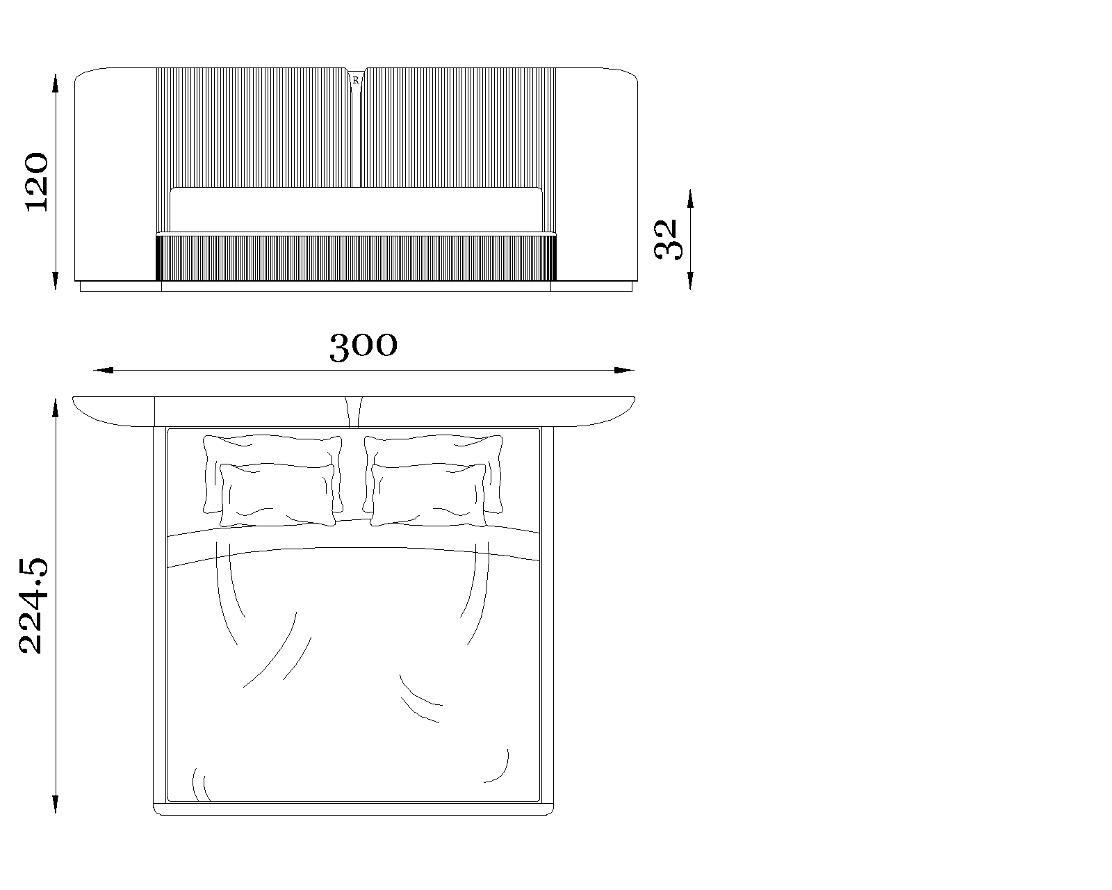 Vogue expresses luxury through soft lines and perfectly balanced proportions. The headboard, featuring elegant vertical ribbing, creates a refined and sensual visual rhythm, enhanced by a central bronze or steel metallic insert that amplifies its brightness and architectural strength. The gently curved sides embrace the bed with fluidity and grace, defining an enveloping, harmonious silhouette.