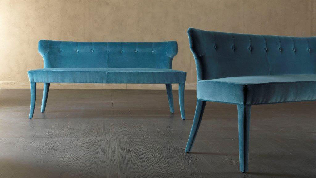 The enveloping lines and slender profile of the Guendalina bench reinterpret a classic aesthetic through a contemporary sensibility. The generously padded seat, ample in proportion yet visually light, is fully upholstered in fabric or velvet, enhanced by sartorial craftsmanship that defines every detail. The gently curved backrest, marked by a refined sequence of buttons, creates a subtle and harmonious rhythm that emphasizes the bench’s elegant character.