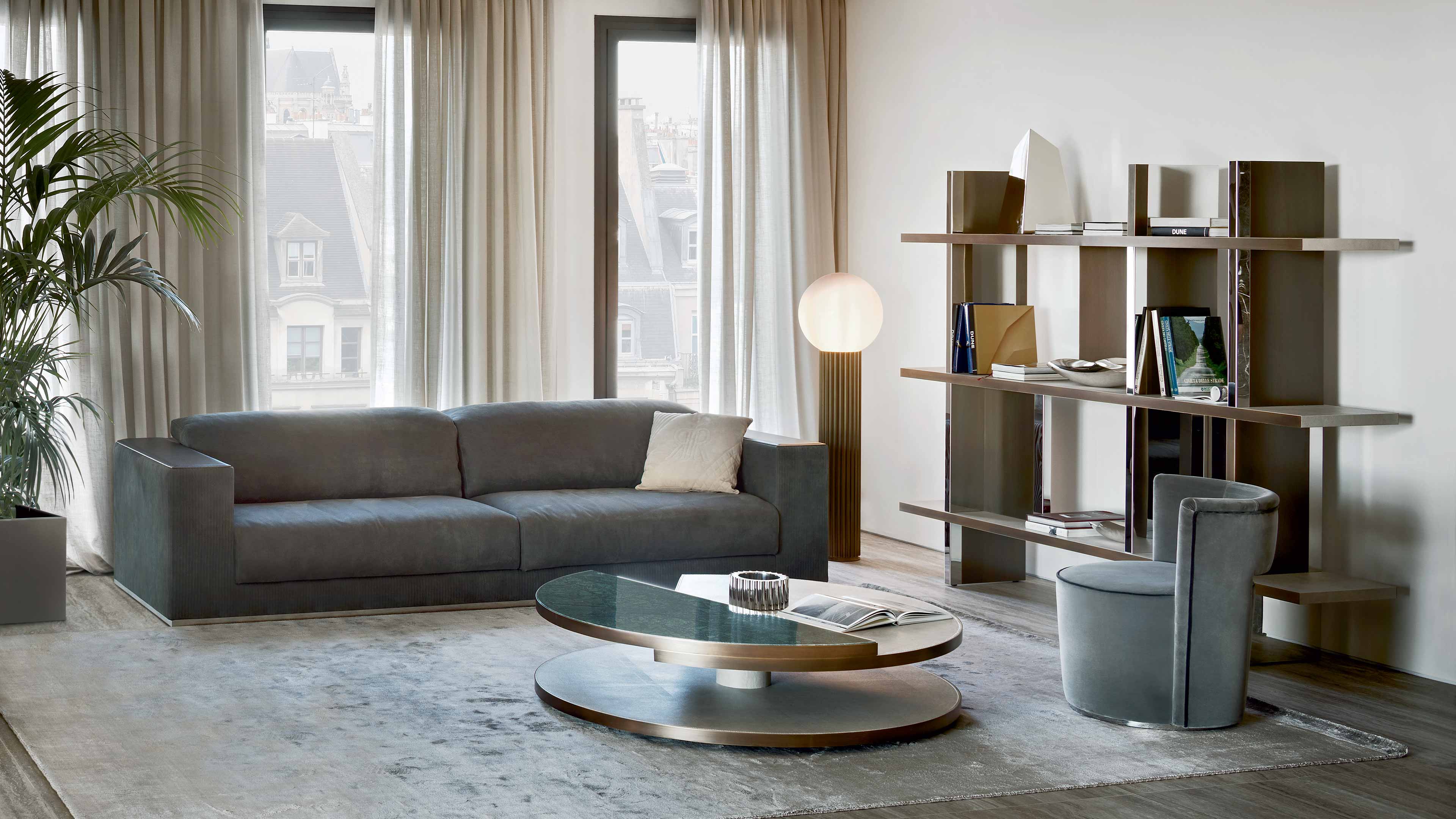 A bold marble with fluid green and grey layering. It transforms the table top into a dynamic natural element of high decorative value.