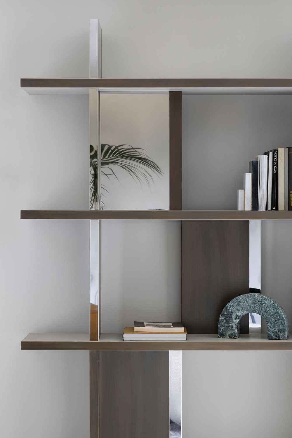 Bookshelves available with bronze and chrome or upholstered structure. Shelves upholstered in leather. Box-compartments with stitched and upholstered doors also available.