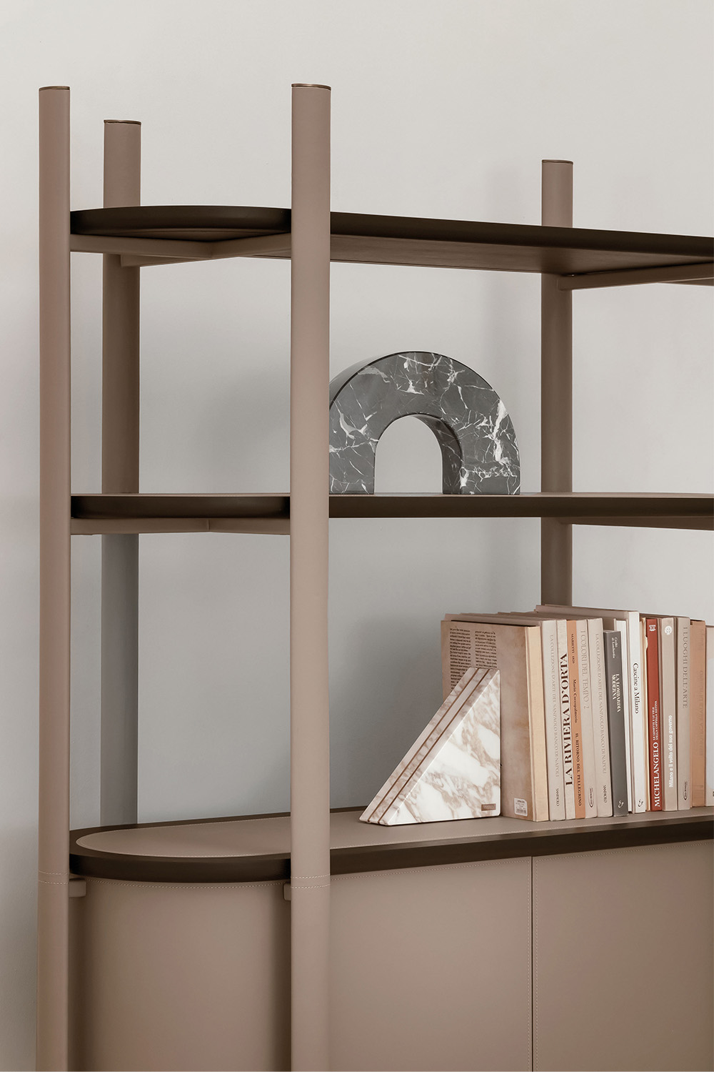 Each piece in the collection features a fully leather-clad structure, enhanced by exposed stitching that highlights its artisanal quality. The slim outer uprights are finished with bronze accents, adding a refined and distinctive touch. The bookcase, slender and airy, is equipped with wooden shelves that alternate open compartments with closed storage, providing versatile organization solutions.