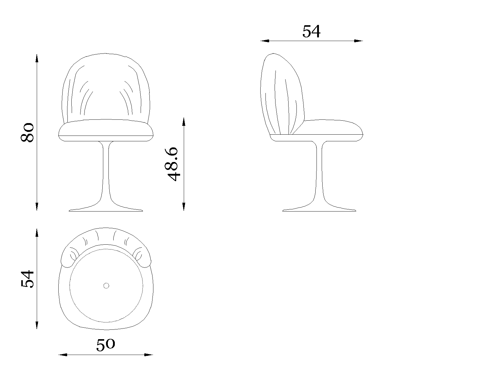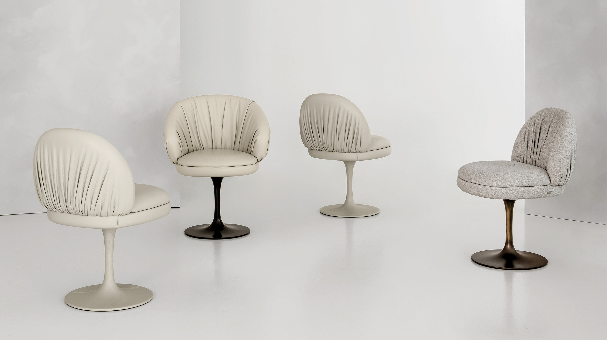 The swivel base introduces a contemporary sense of fluidity, turning everyday use into a spontaneous and functional gesture. The design retains its gentle, sculptural elegance, yet gains dynamism and practicality, following the body’s movement and making the chair even more versatile for modern living. A technical detail integrated with natural ease, without disrupting the aesthetic coherence of the piece.