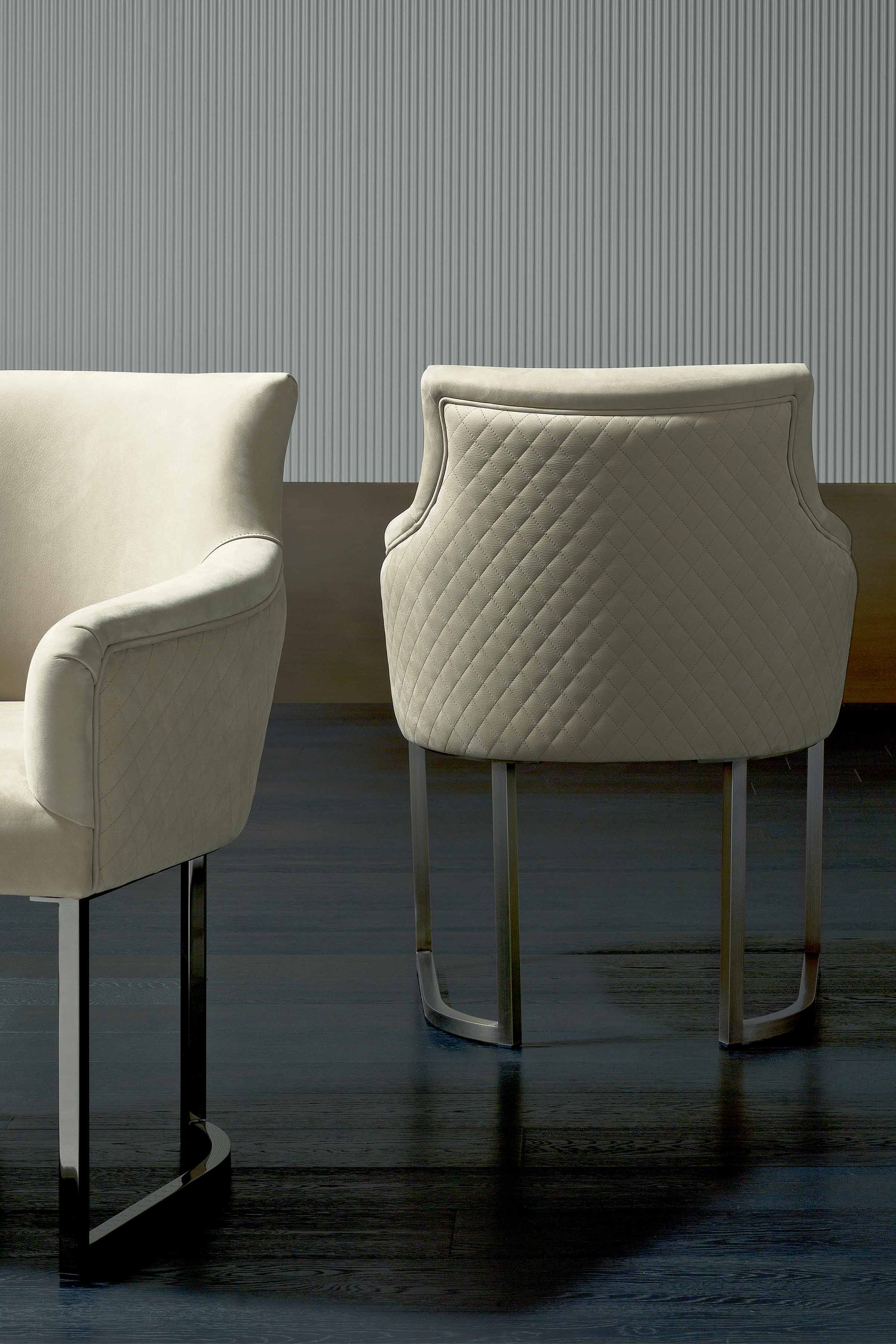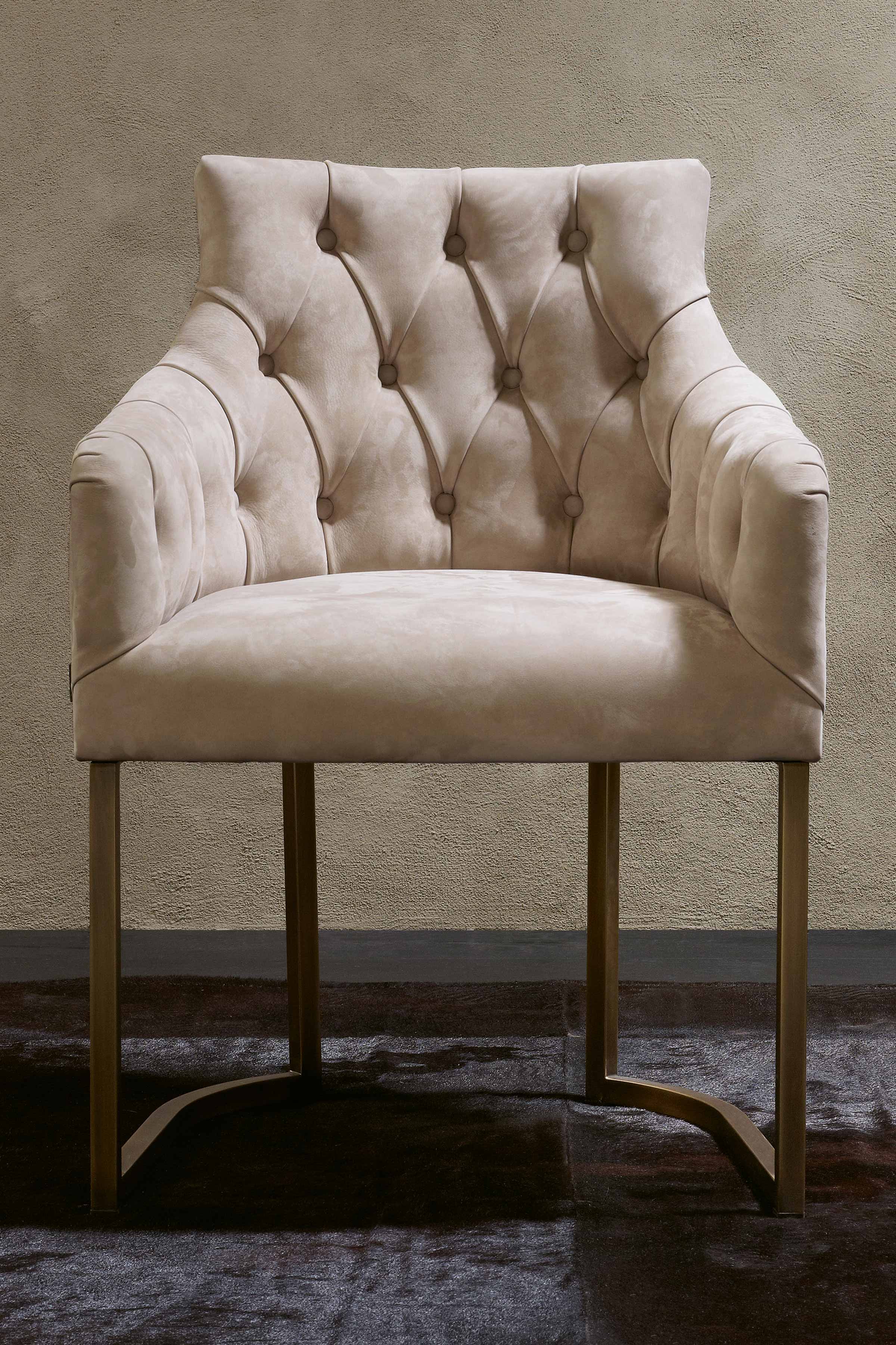 Upholstered chair with metal legs. Available with outer backrest and outer armrests in capitonné or printed leather.