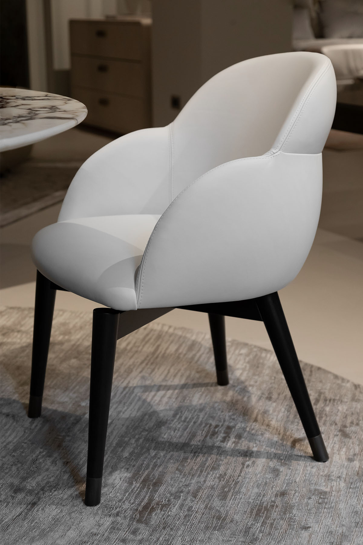 The Michelle chair reflects Rugiano’s philosophy with a design that combines softness with formal rigor. The padded shell, fully upholstered in fine leather or exquisite fabric, is defined by sinuous, continuous lines that envelop the seat with natural elegance. The embracing backrest and integrated armrests create a fluid, sophisticated gesture, immediately conveying comfort and hospitality.