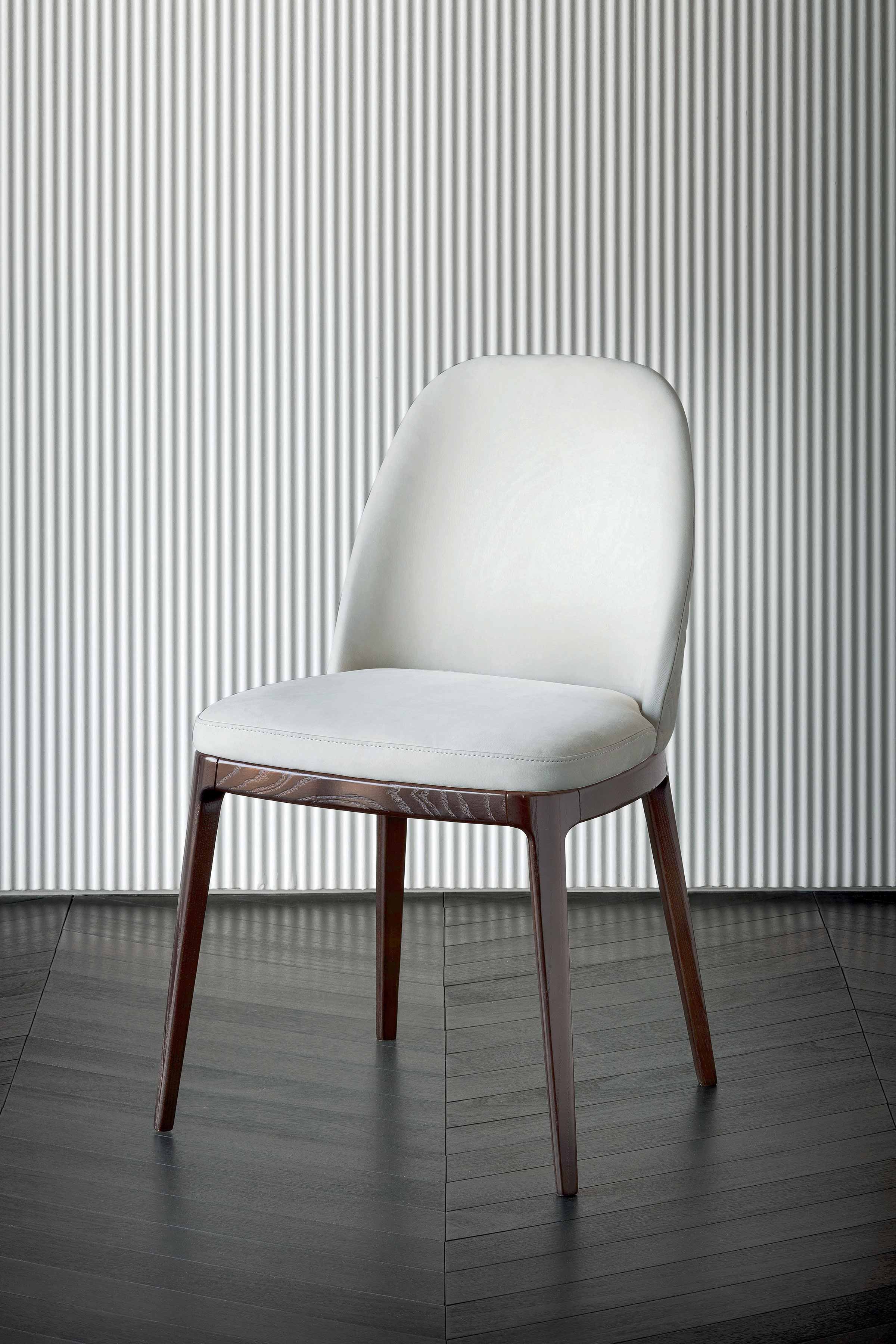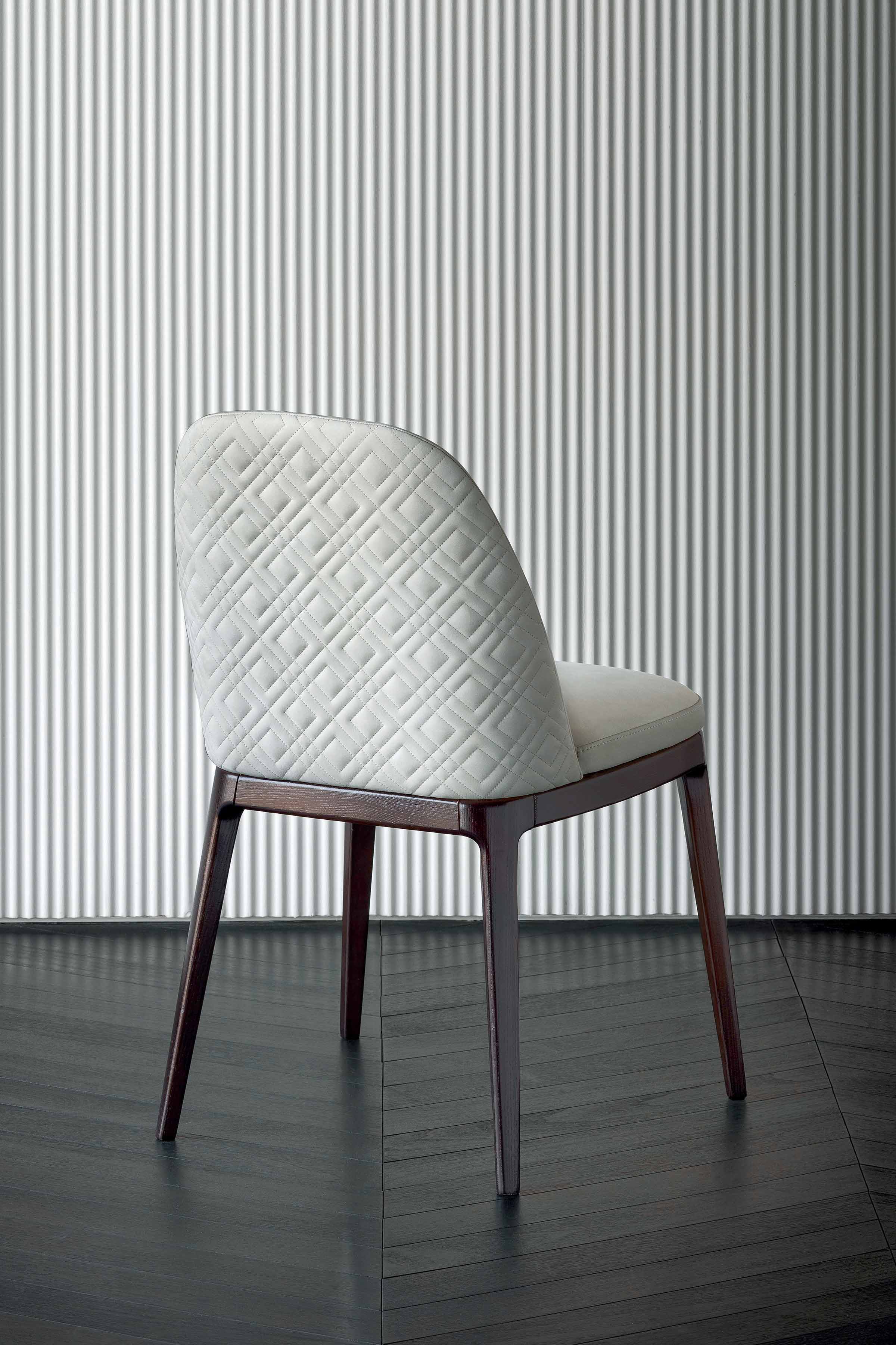 Upholstered chair, also available with high back, with wooden legs. Outer backrest plain or with ELLE stitching.
