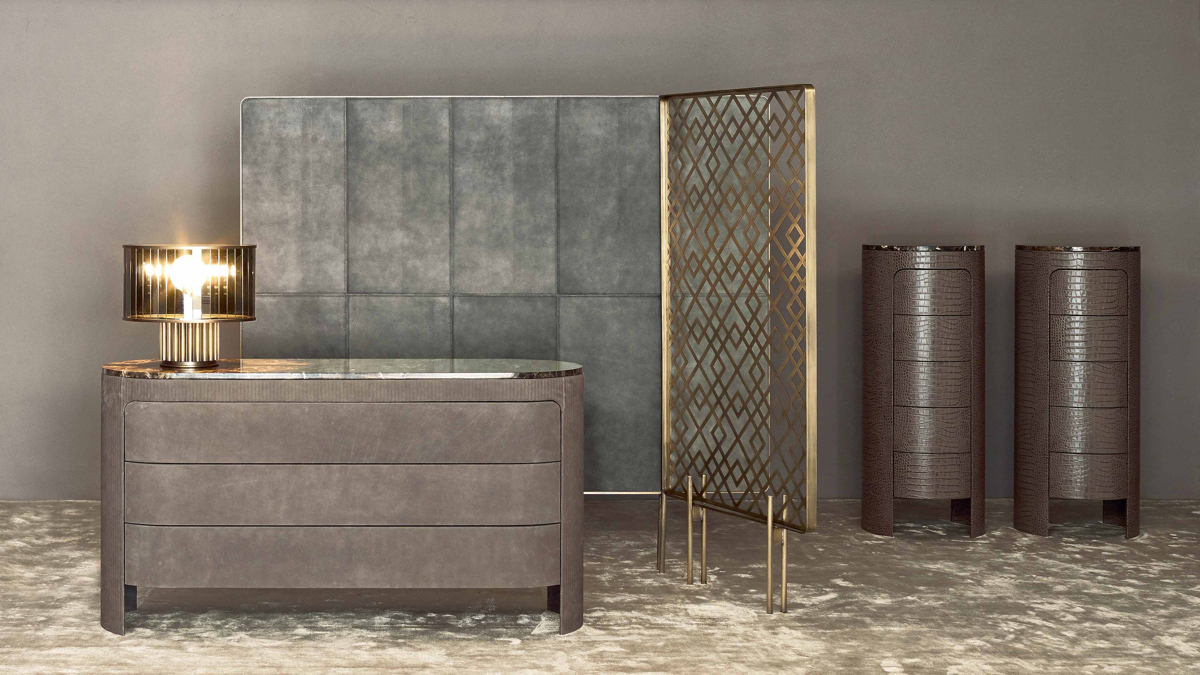 The front drawers, seamlessly integrated into the curved structure, preserve the purity of the design without interruption. The leather wraps continuously around the volumes, highlighting Rugiano’s artisanal mastery and the unmistakable sartorial character of the piece. The marble top introduces a precious, luminous accent, creating a refined dialogue with the leather surfaces.