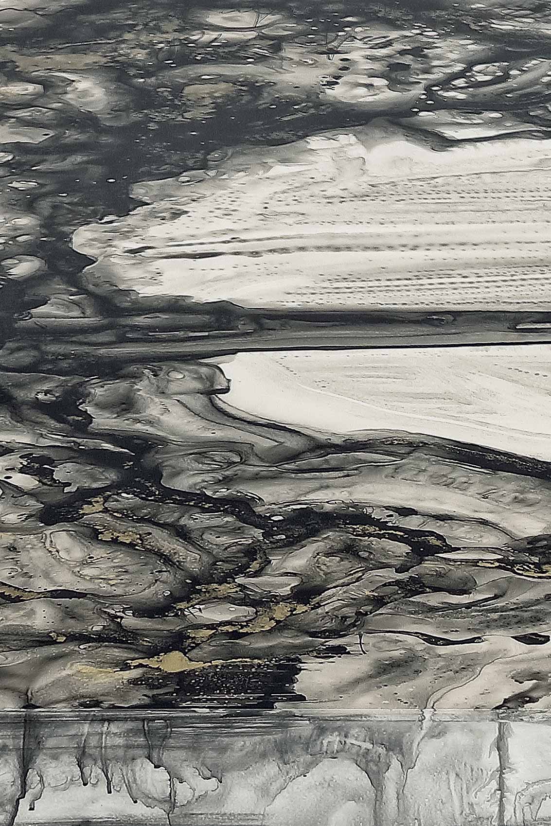 Technical decoration based on the contrast between a neutral base and saturated charcoal grey and black fields. The manual craftsmanship creates a dynamic and deep cloudy effect.