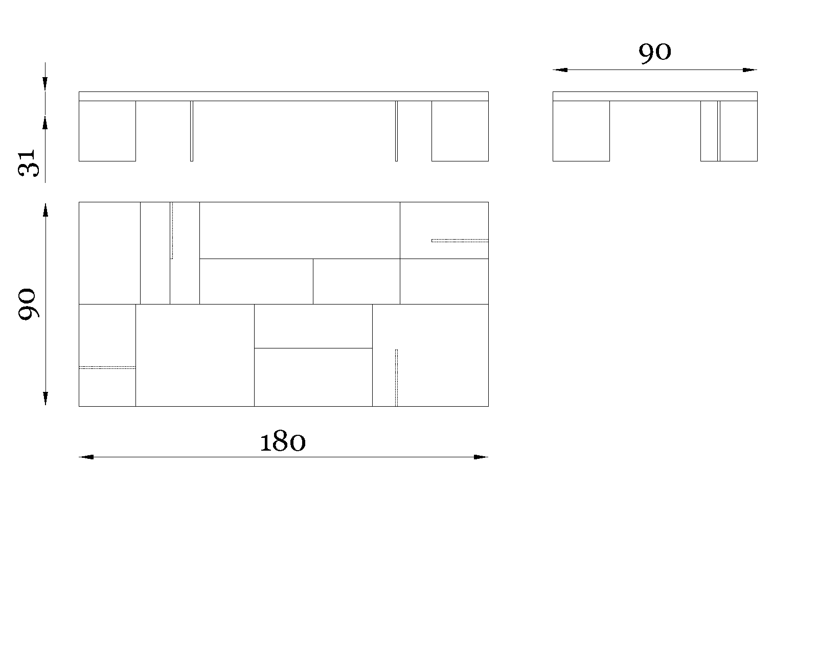Range of coffee tables with hand-brushed bronze metal top. The different directions of the panels create geometrical and light plays.