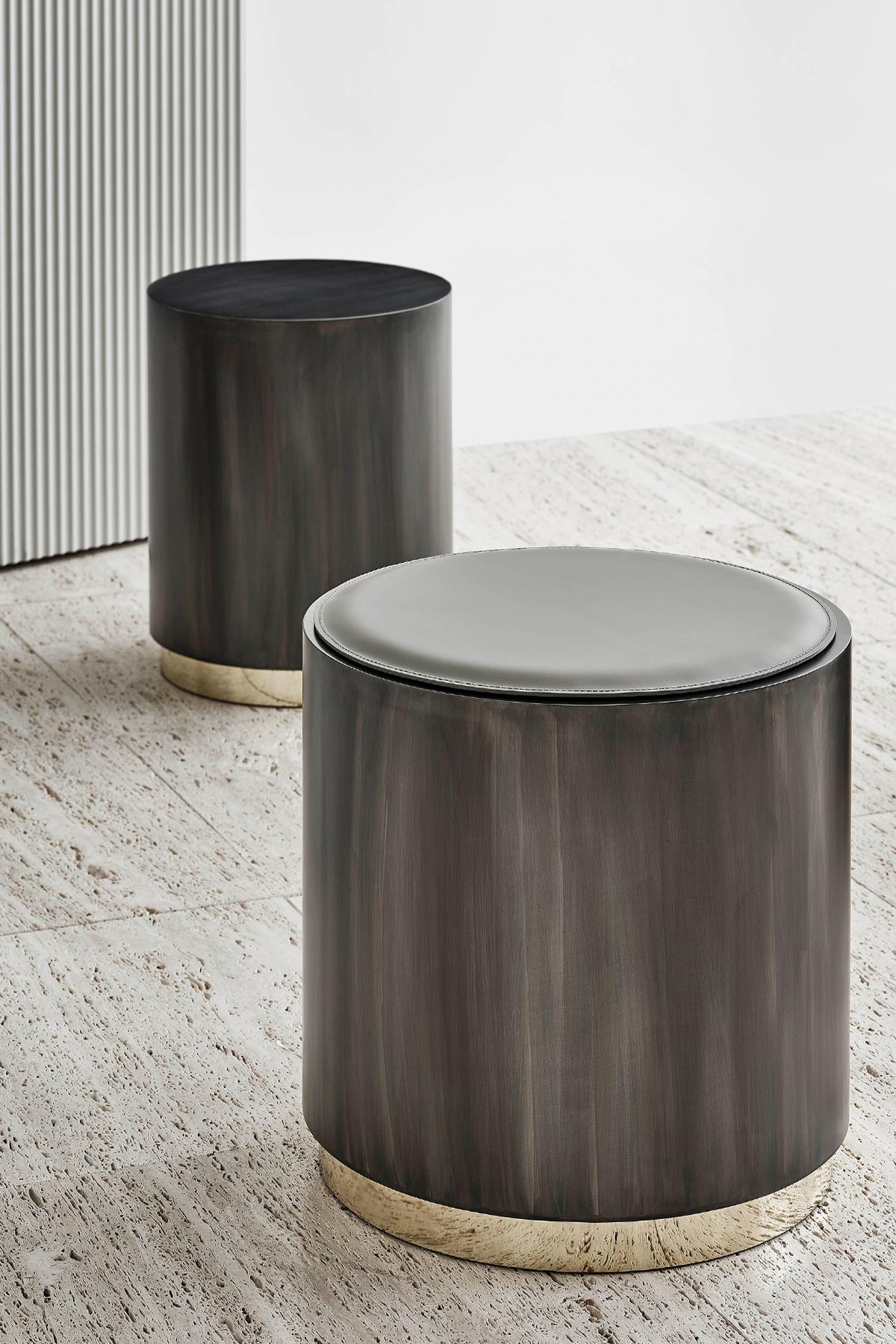 Flamed iron with glossy gold details to enhance the essential shapes. Different sizes and additional seat cushion to transform them into comfortable seats