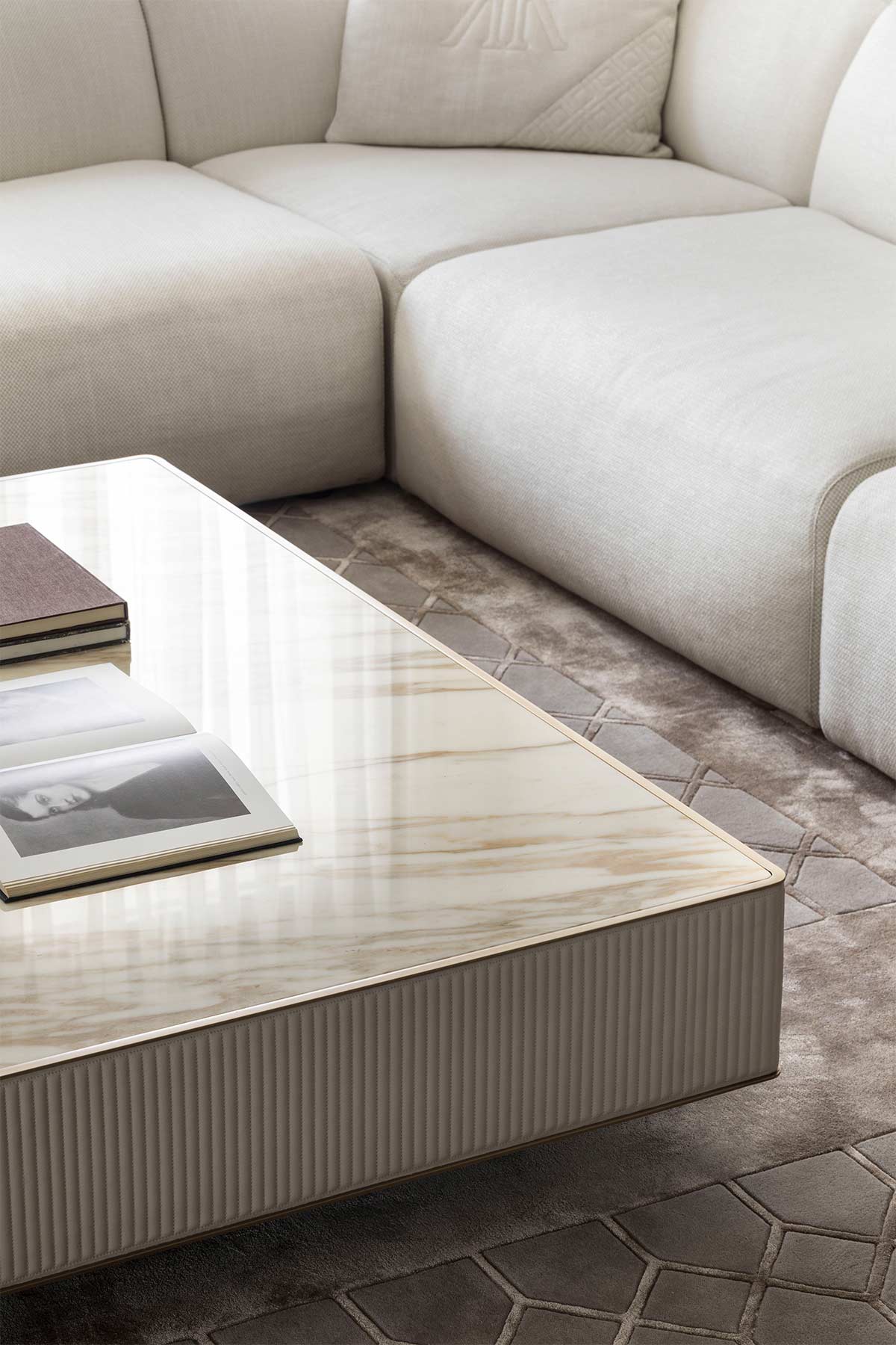 A precious calcite with ethereal, translucent tones. The neutral background, enriched by delicate crystalline shades, gives coffee tables unparalleled visual lightness and brightness.