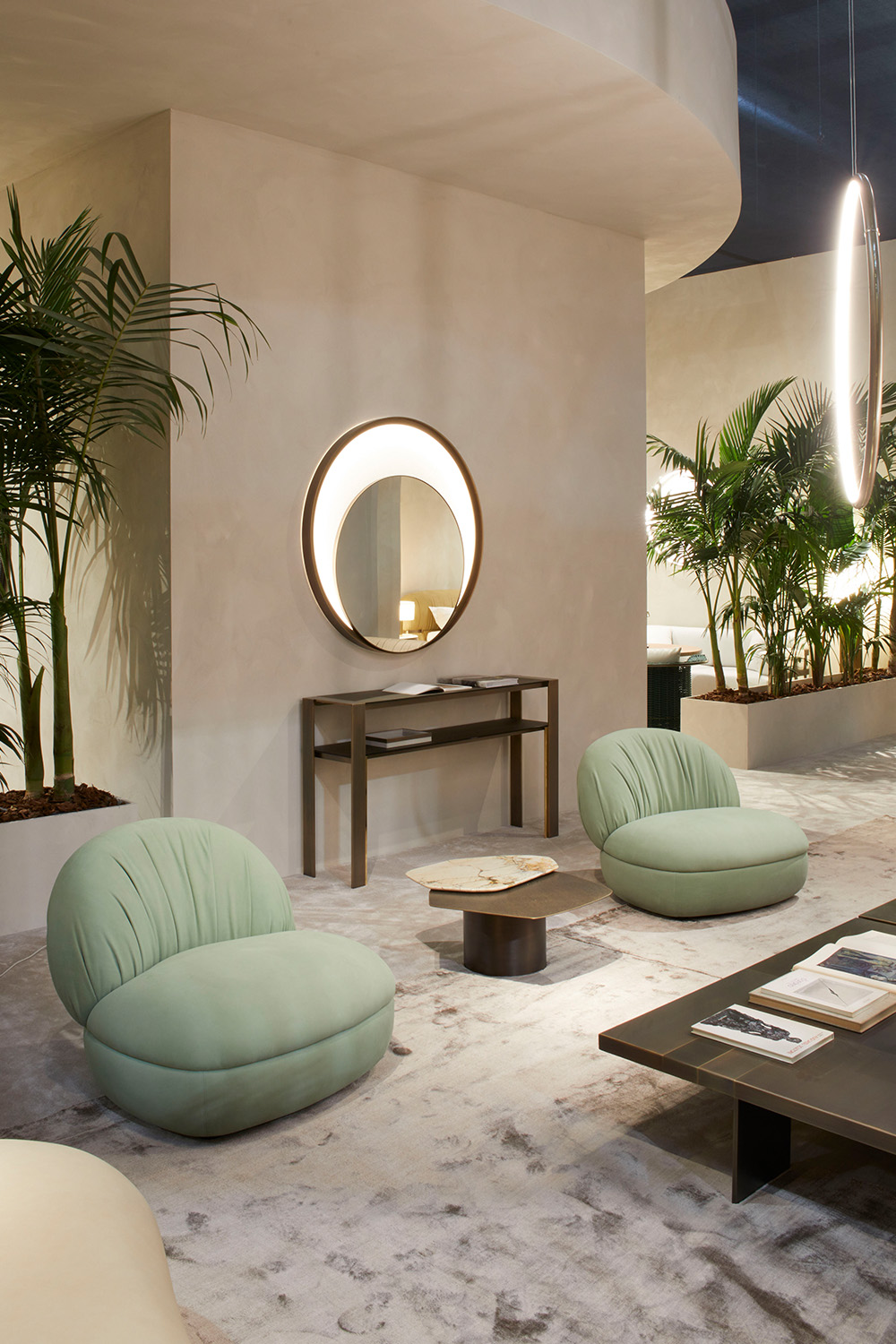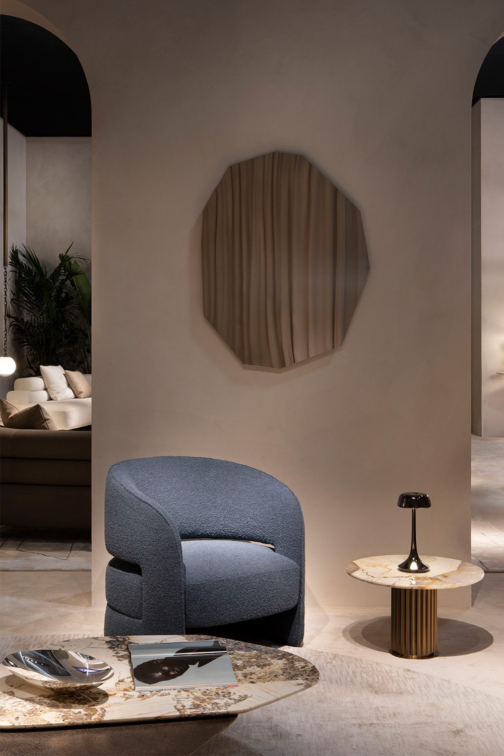A bold marble with fluid green and grey layering. It transforms the table top into a dynamic natural element of high decorative value.