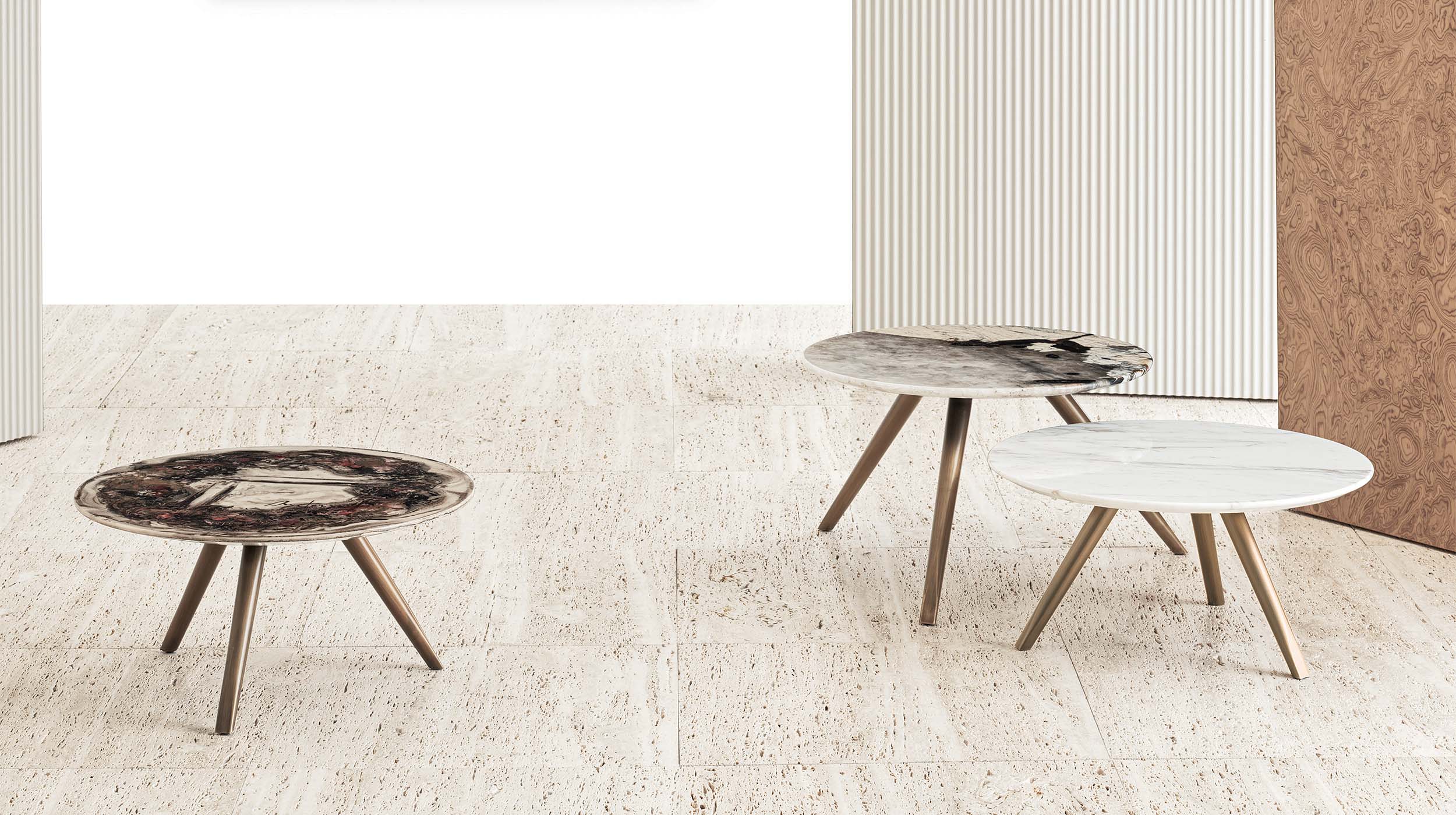 Iconic stone with warm tones from sand to hazelnut. Its striated structure gives table tops a monumental, solid, and timeless appearance.