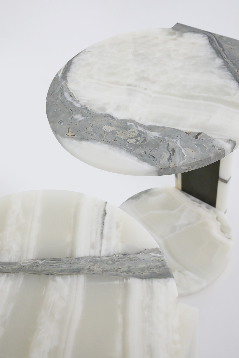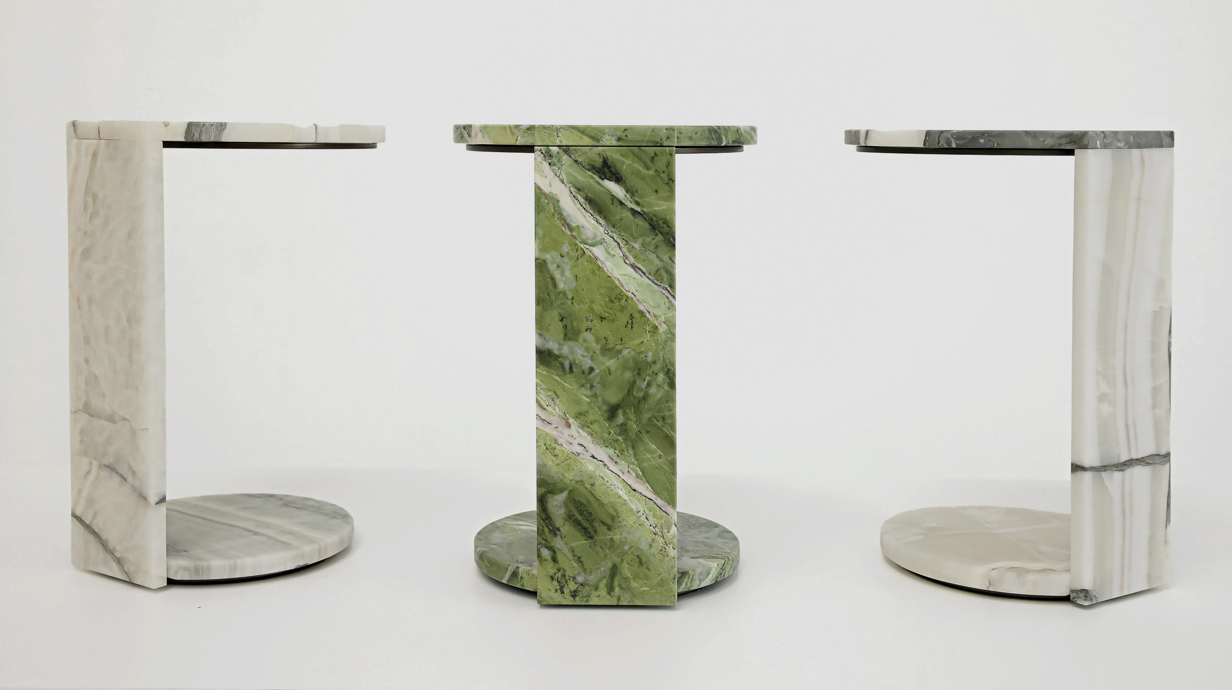 The Paride side table is a sculptural and contemporary piece, where essential volumes are arranged with precision and balance. Its silhouette, defined by a C-shaped profile composed of top, base, and central column, evokes a strong architectural presence while retaining a light and refined character.