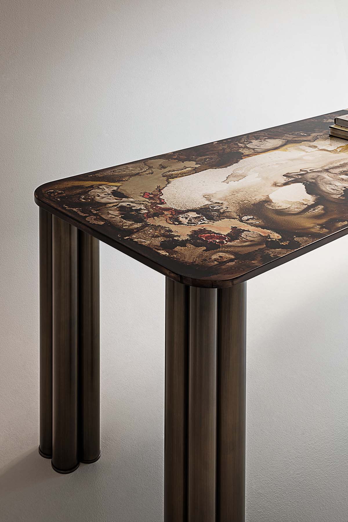 High-end lacquering based on absolute contrast. Deep black serves as a base for gold flows and splashes, creating a finish with a strong graphic and artisanal identity.