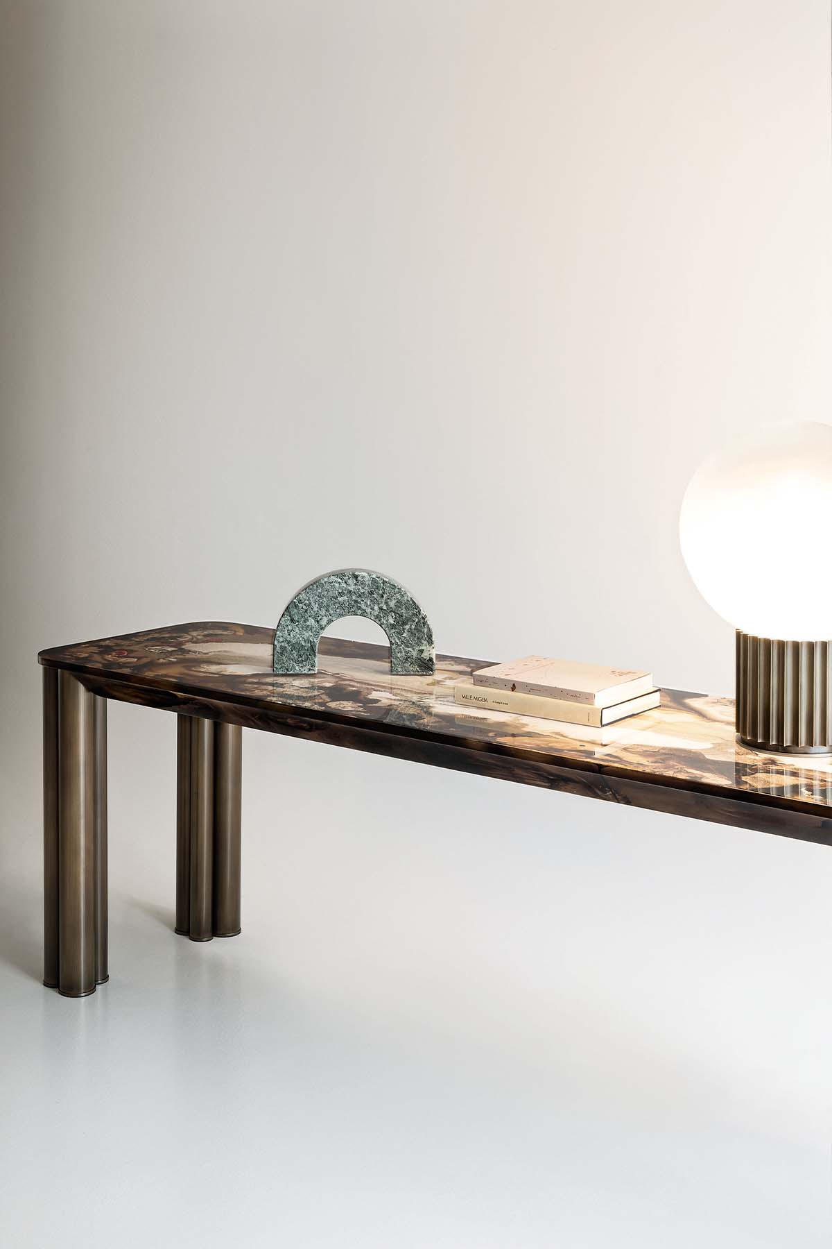 A bold marble with fluid green and grey layering. It transforms the table top into a dynamic natural element of high decorative value.