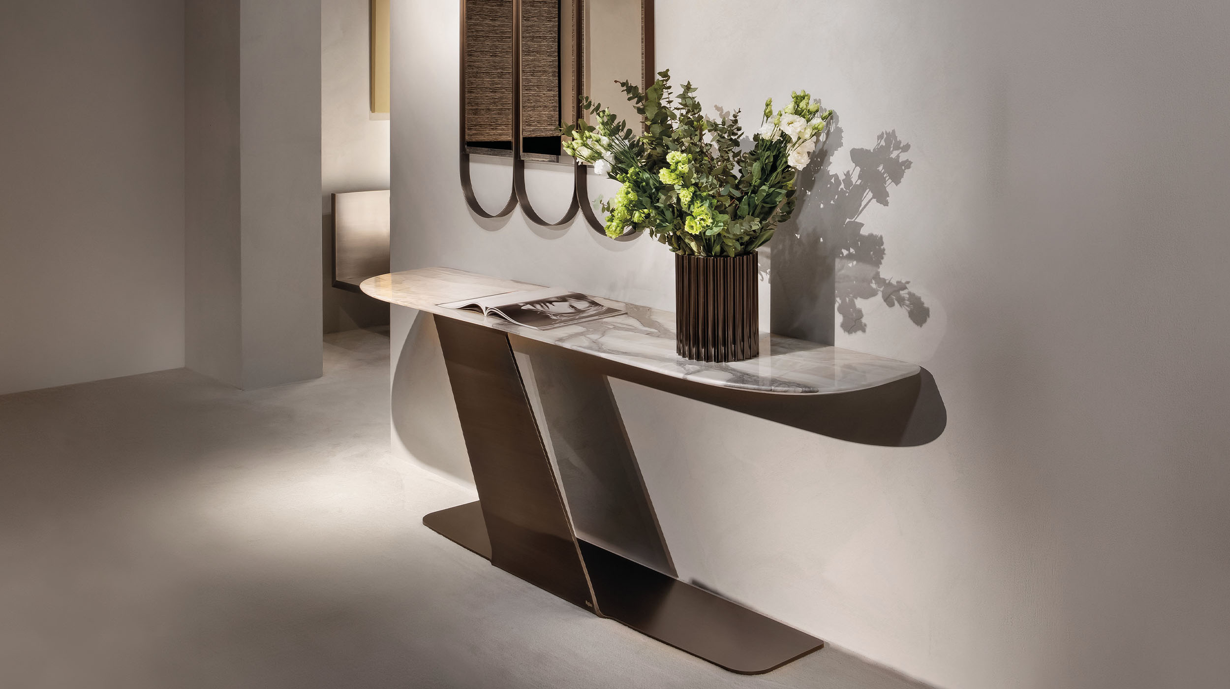 A bold marble with fluid green and grey layering. It transforms the table top into a dynamic natural element of high decorative value.