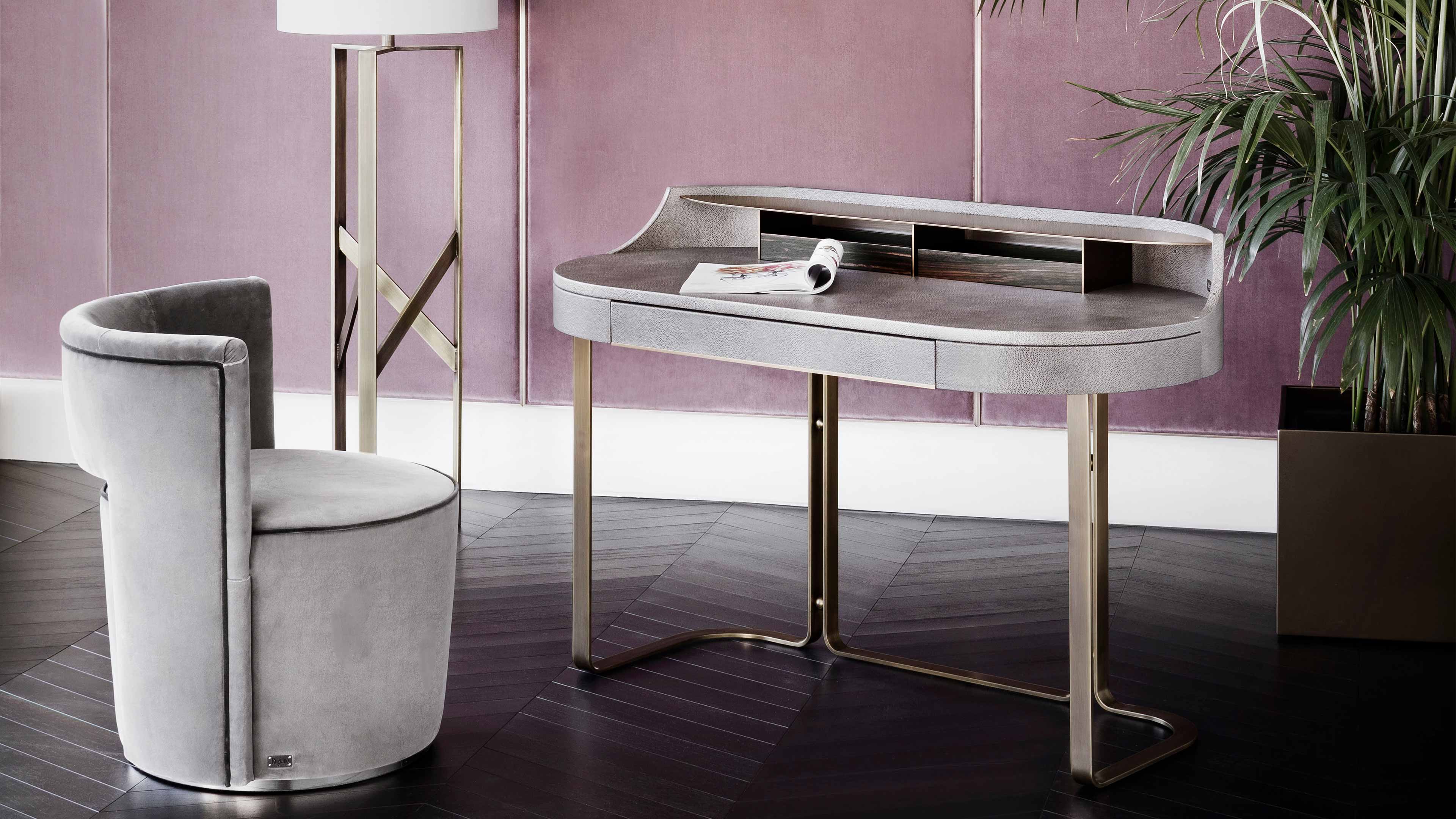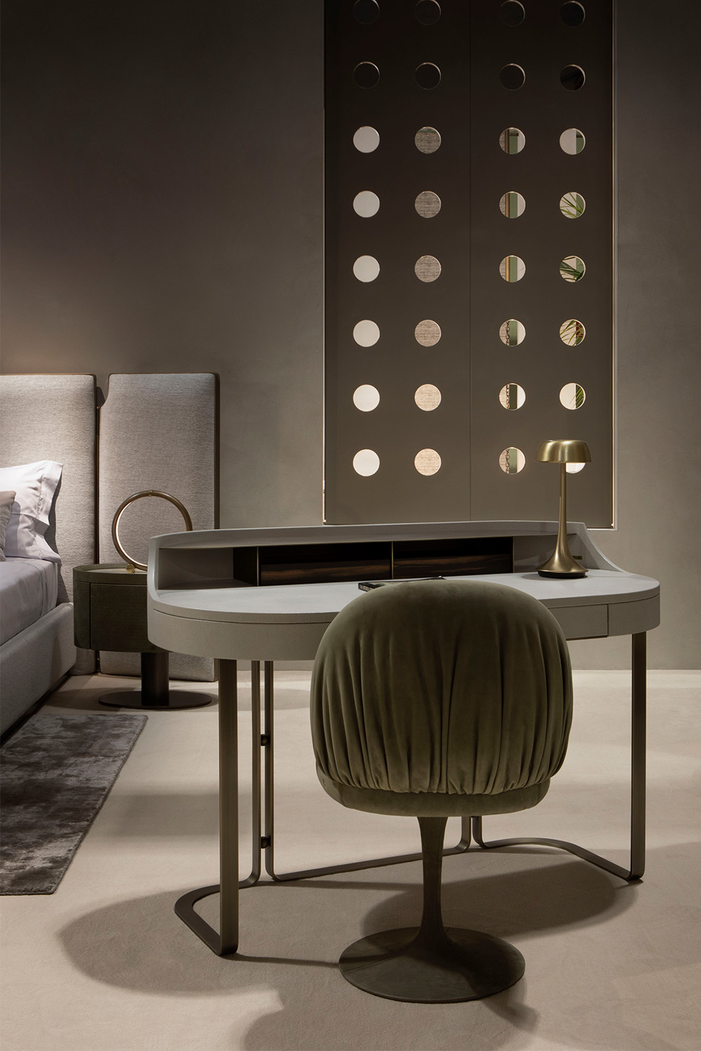 A bold marble with fluid green and grey layering. It transforms the table top into a dynamic natural element of high decorative value.