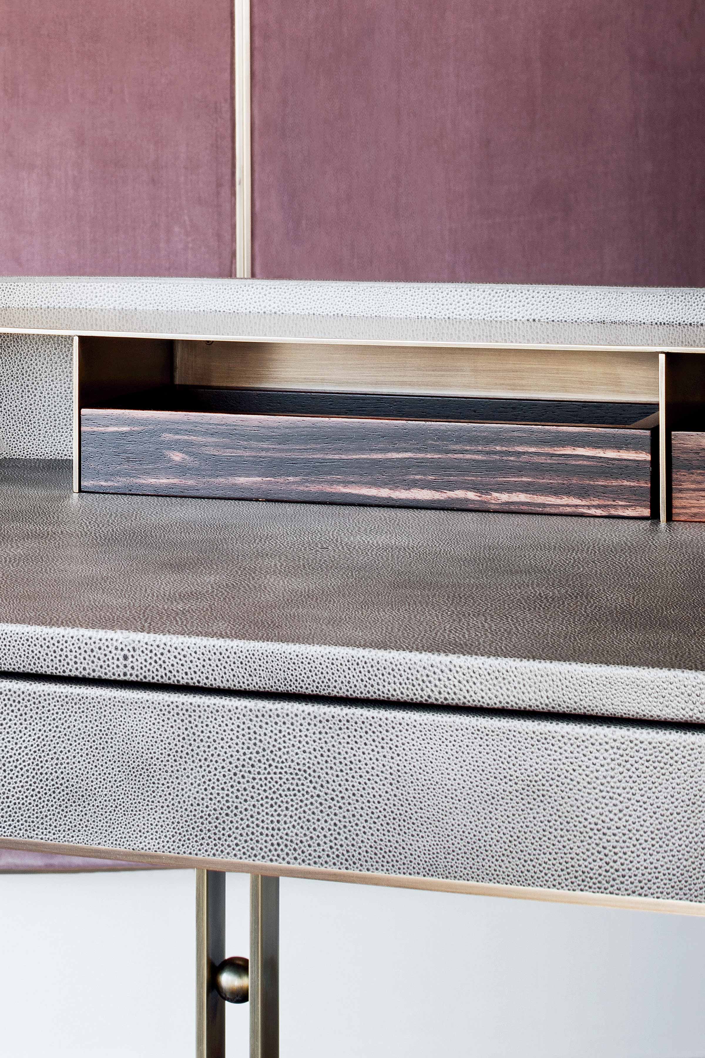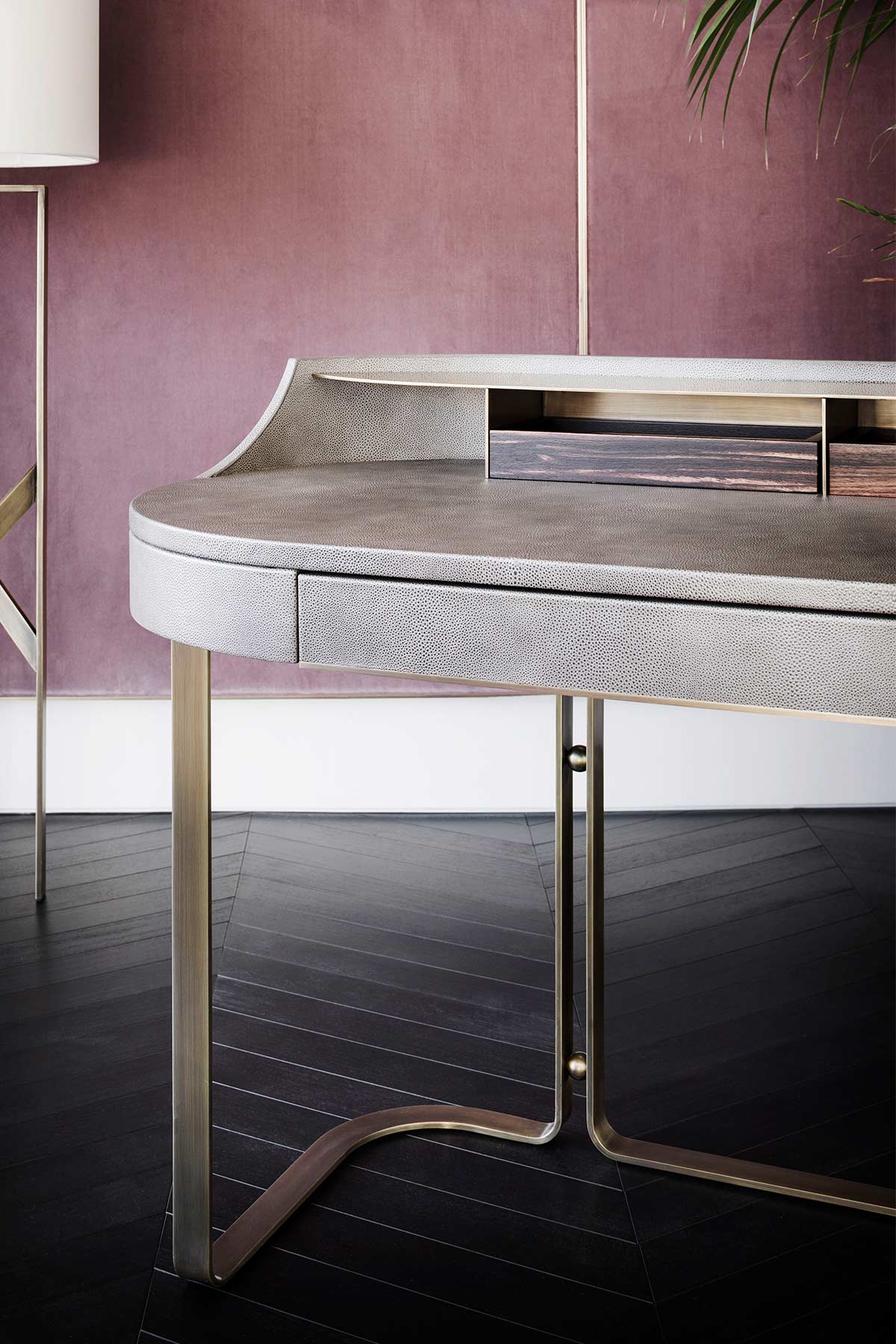 Desk with bronze finished structure and upholstered top with small compartments and a drawer.