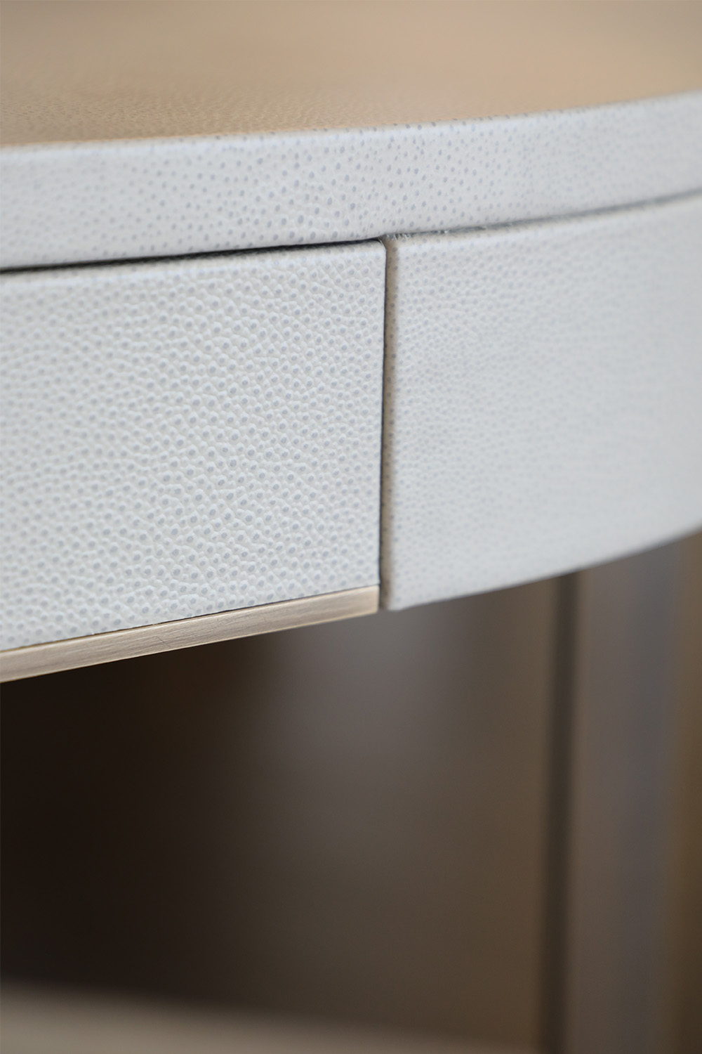 A technical and minimalist surface. The fine brushing of the steel creates a professional matte texture, both resistant and luminous, perfect for enhancing the geometric design of the bases.
