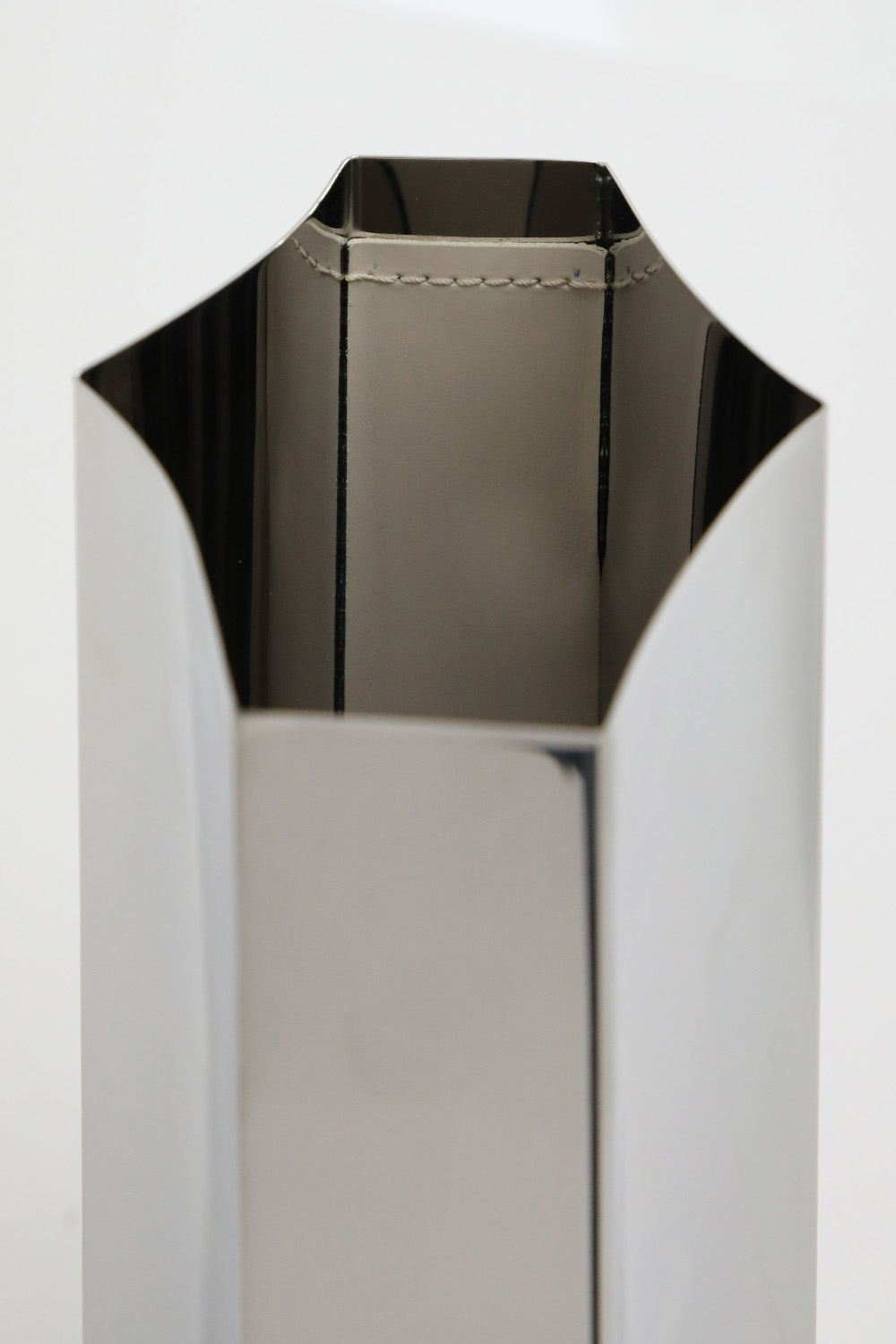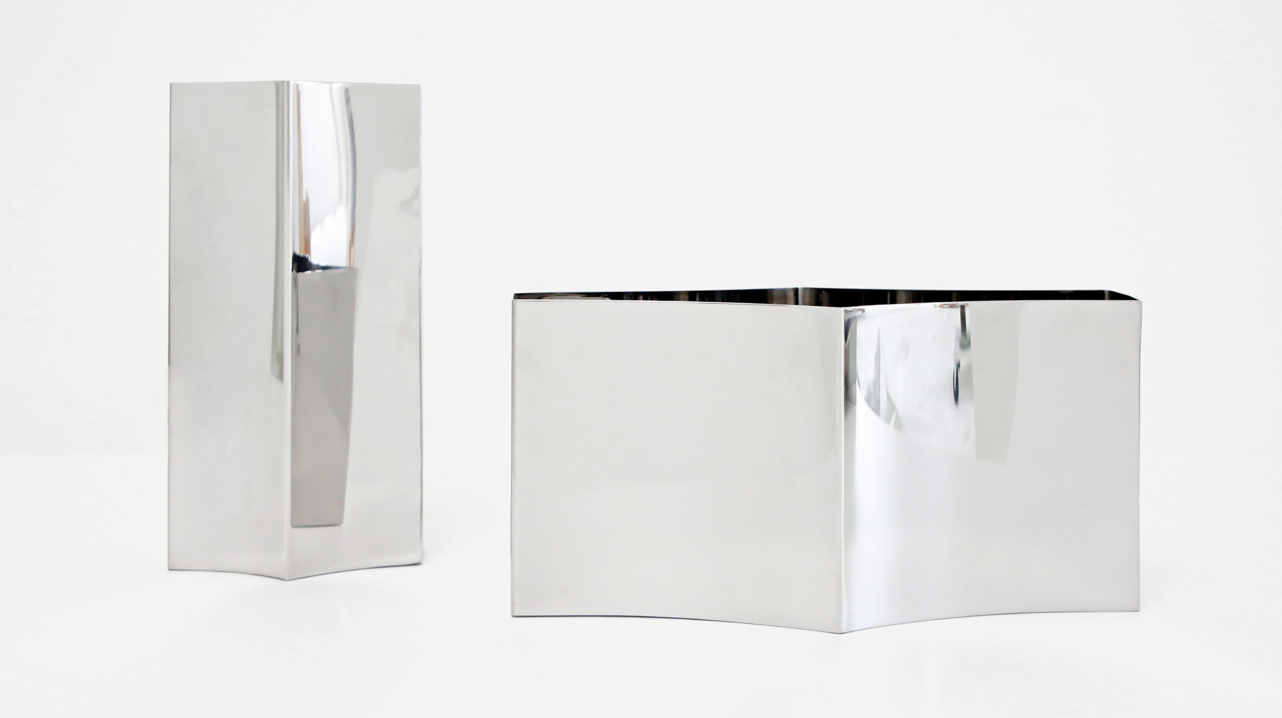 A technical and minimalist surface. The fine brushing of the steel creates a professional matte texture, both resistant and luminous, perfect for enhancing the geometric design of the bases.