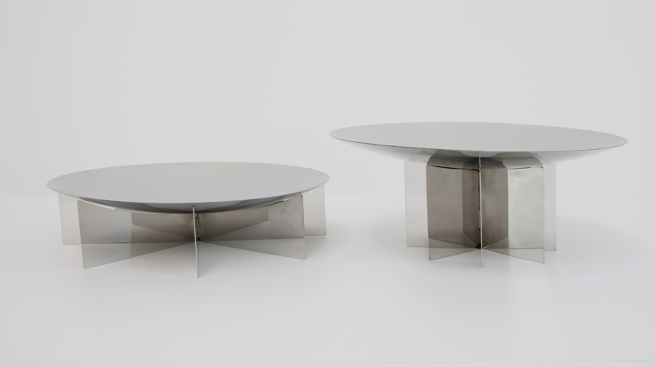 A technical and minimalist surface. The fine brushing of the steel creates a professional matte texture, both resistant and luminous, perfect for enhancing the geometric design of the bases.