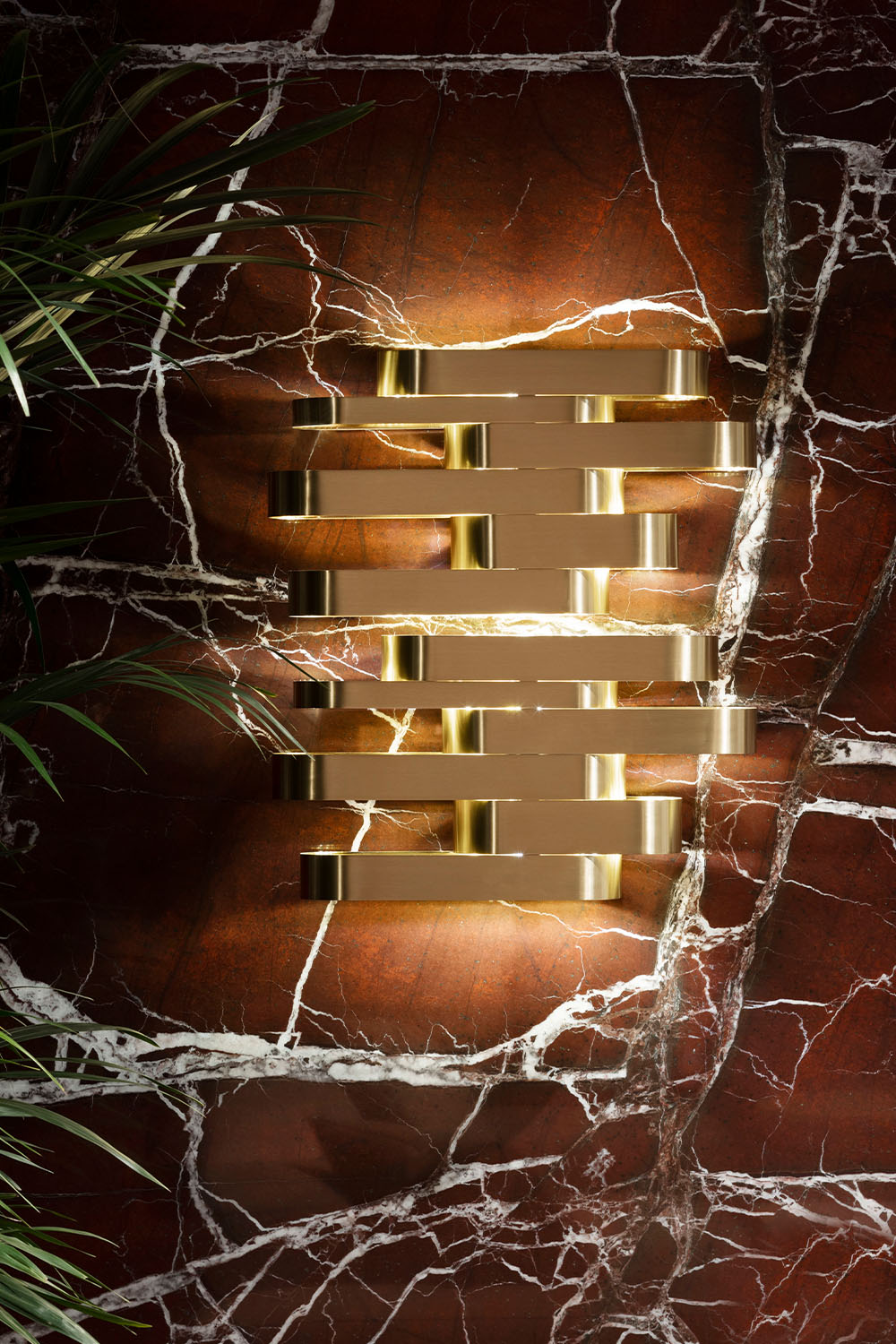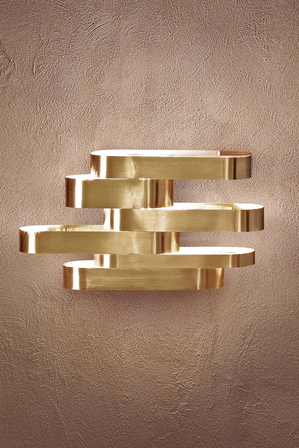 Wide range of brass lamps, including wall lamps and table lamps where linear and round lines create harmonious shapes.