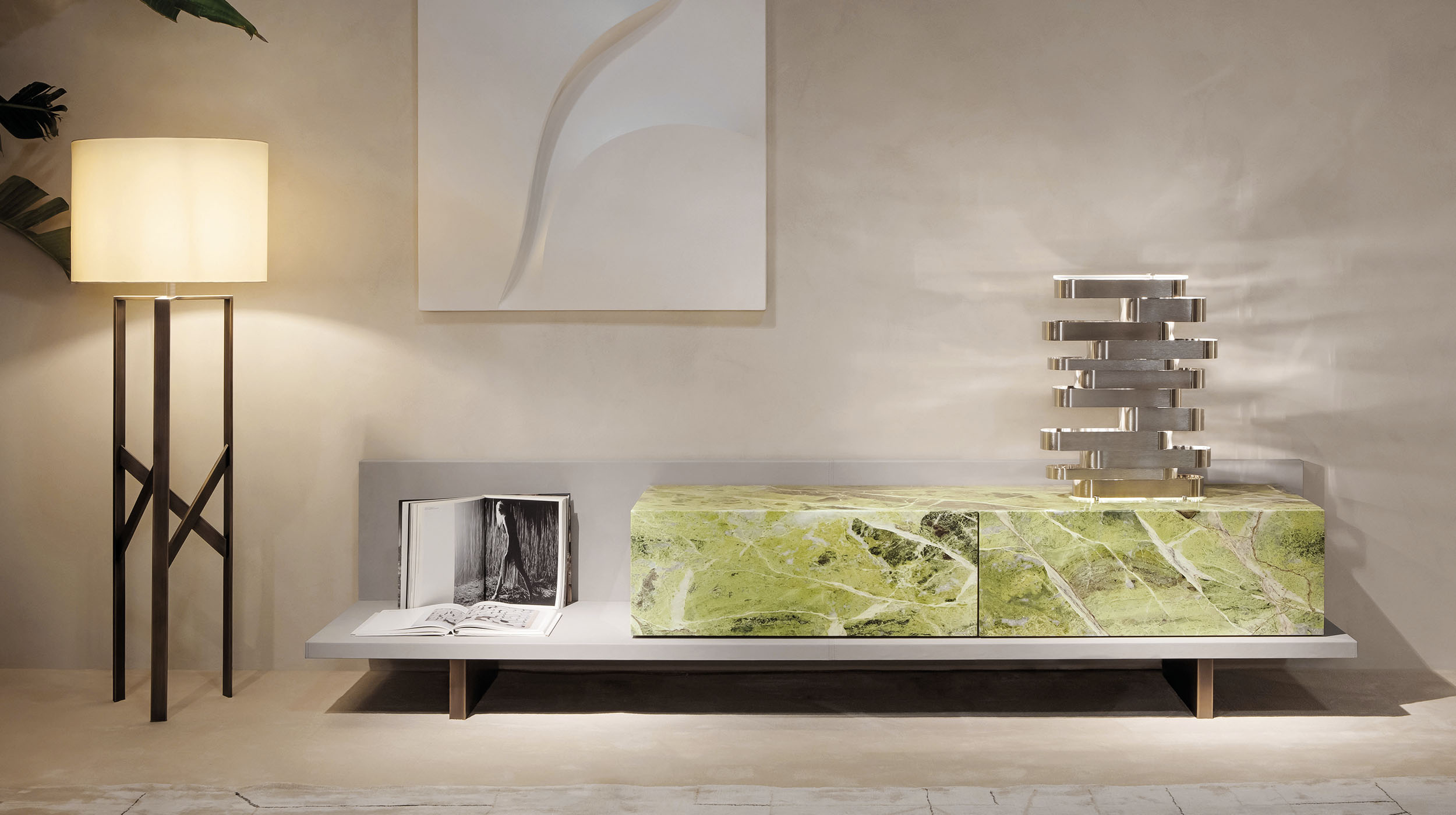 A technical and minimalist surface. The fine brushing of the steel creates a professional matte texture, both resistant and luminous, perfect for enhancing the geometric design of the bases.