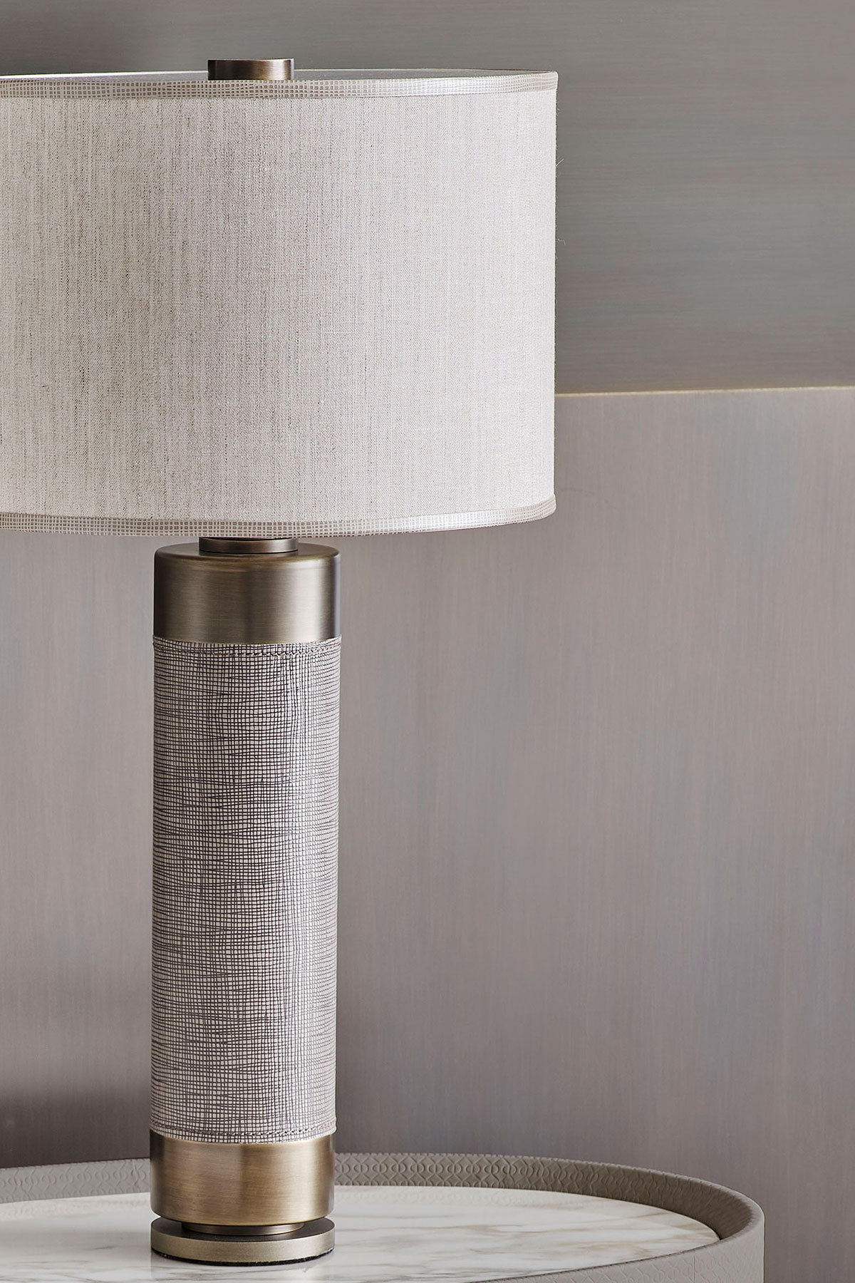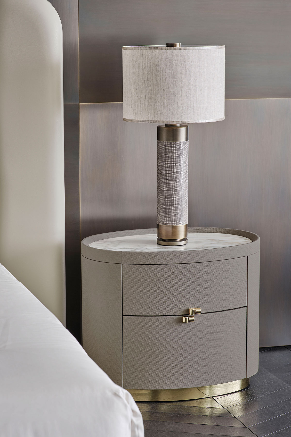 Leather and metal details for the bedside table lamp with clean and essential lines.