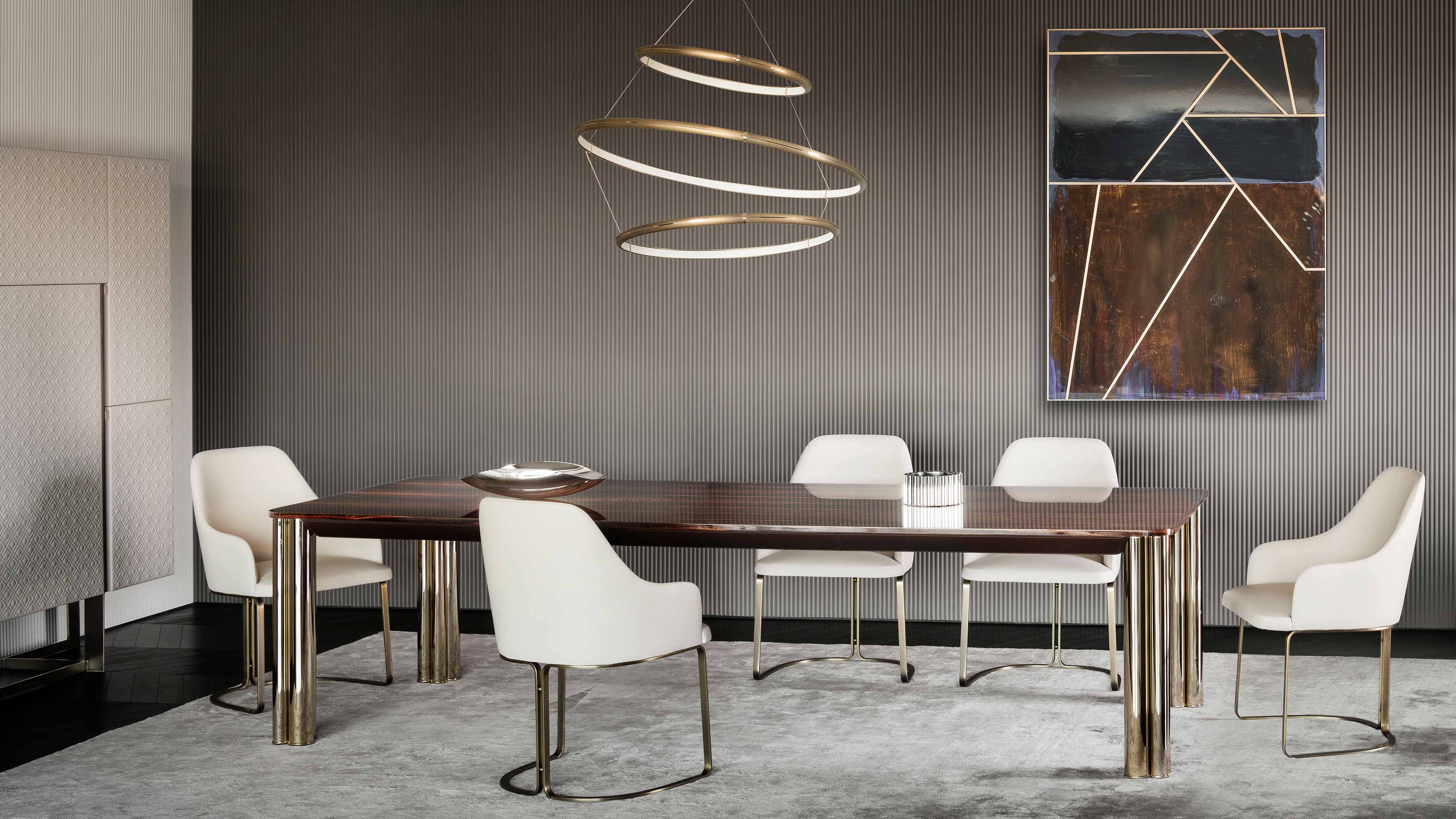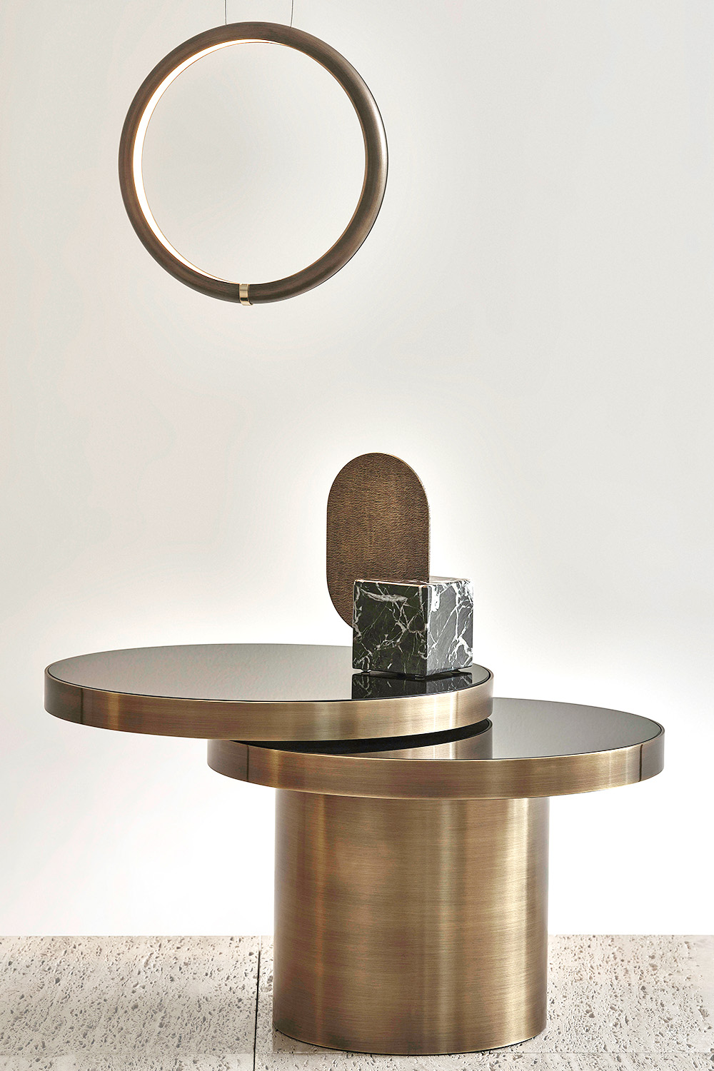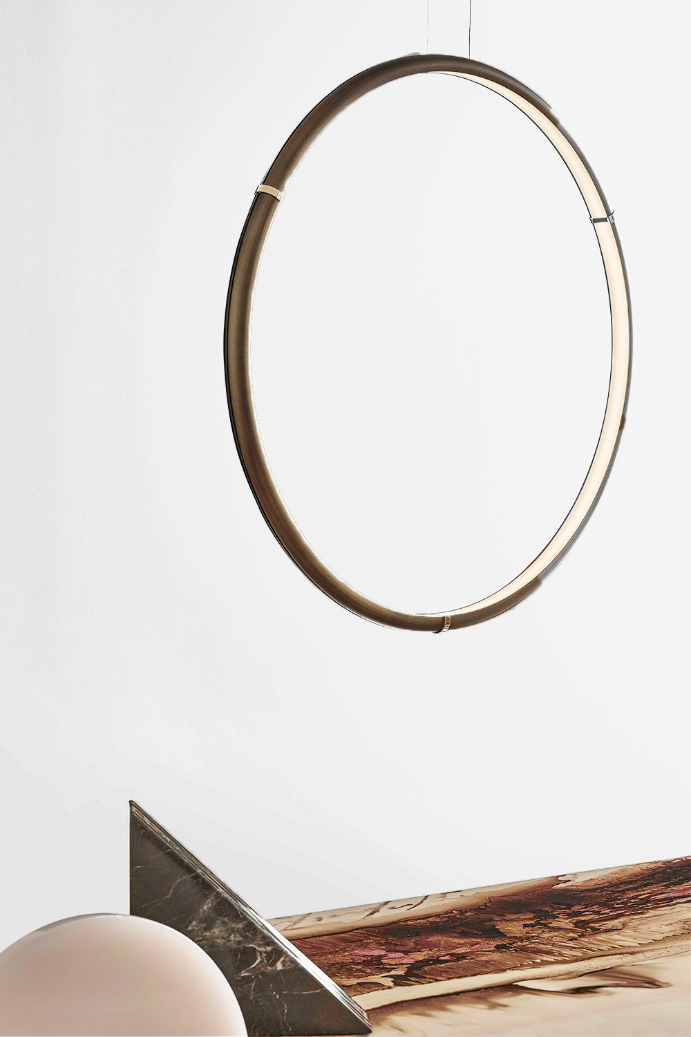 Range of bronze lamps with glossy gold details, also including wall and table lamp. The rings can be used individually or to create harmonious compositions.