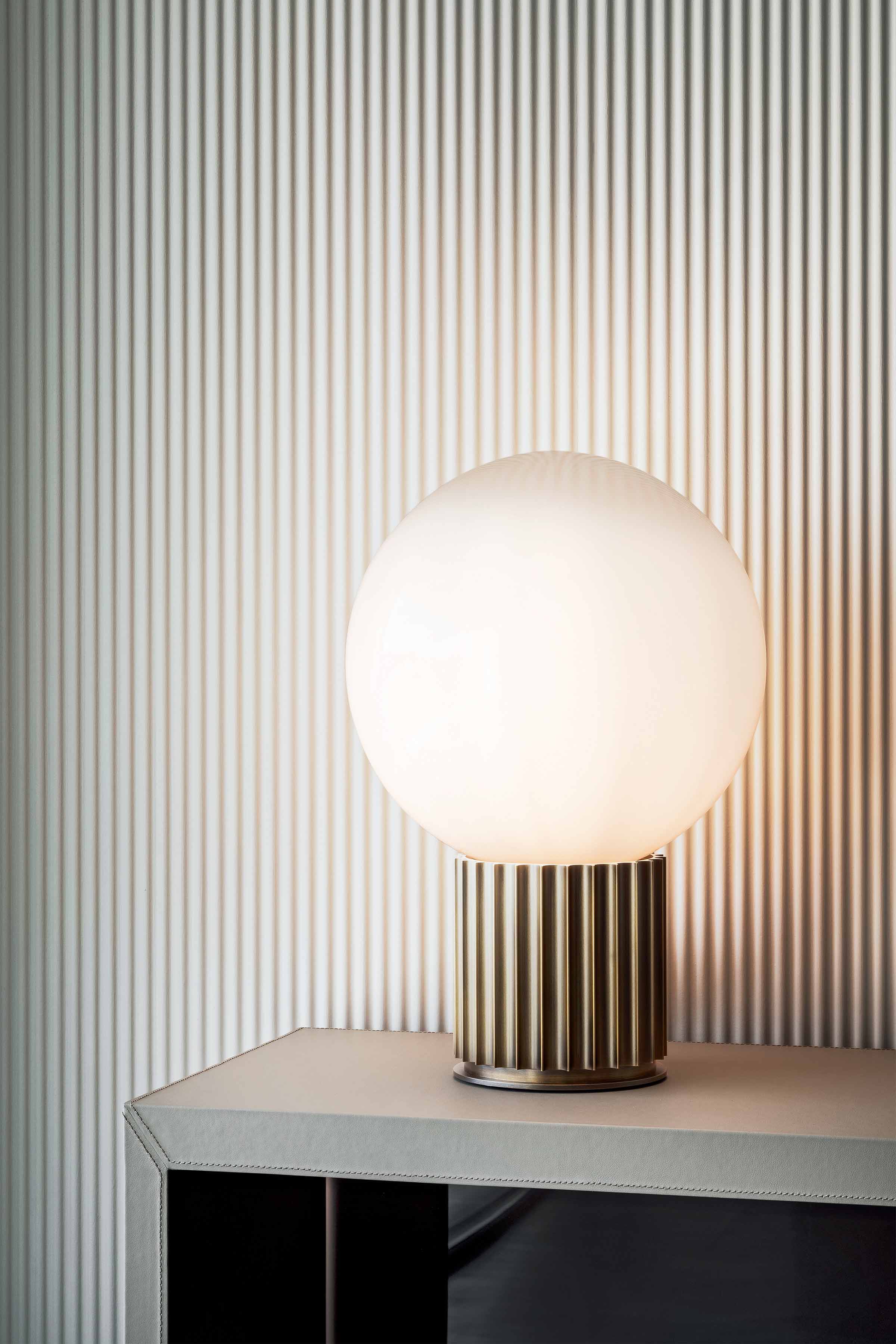 Range of lamps characterised by the column-like base, an aluminium extrusion finished in bronze, black chrome or glossy gold.