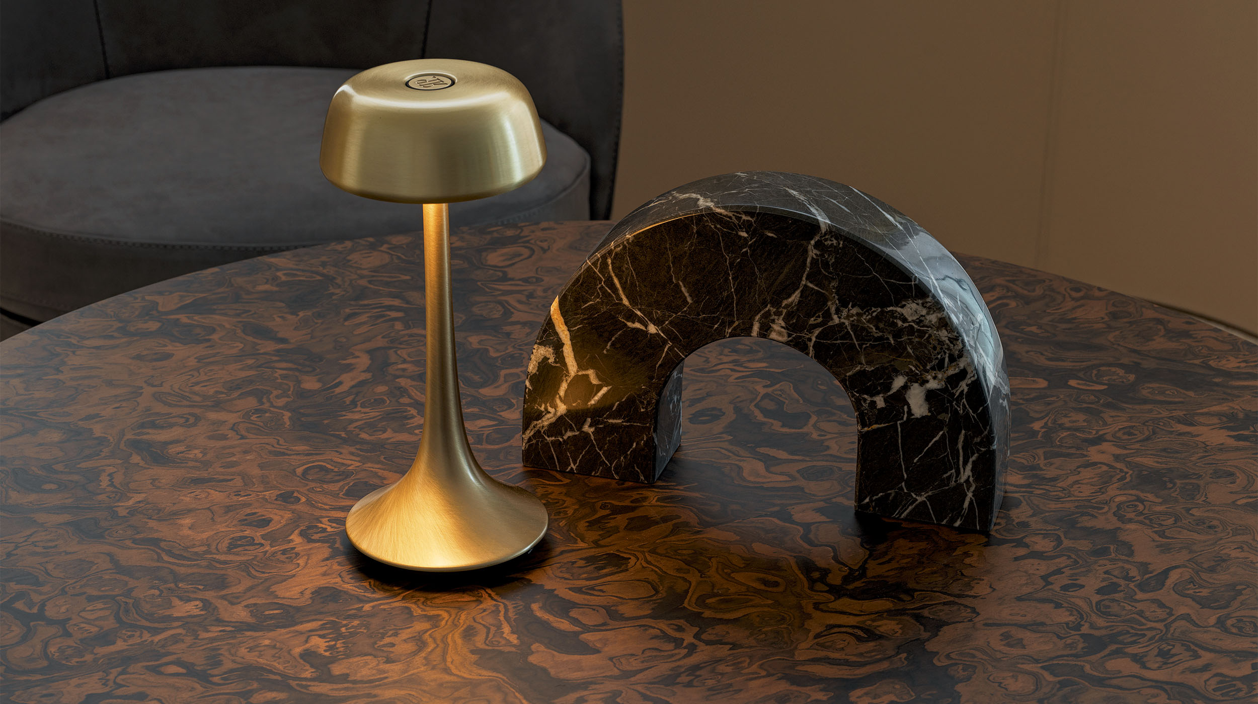 Collection of lamps of different sizes. Feature of the smallest is that it is portable, rechargeable and adjustable by touch. The other classic lamps, the floor lamp enriched by a marble table.