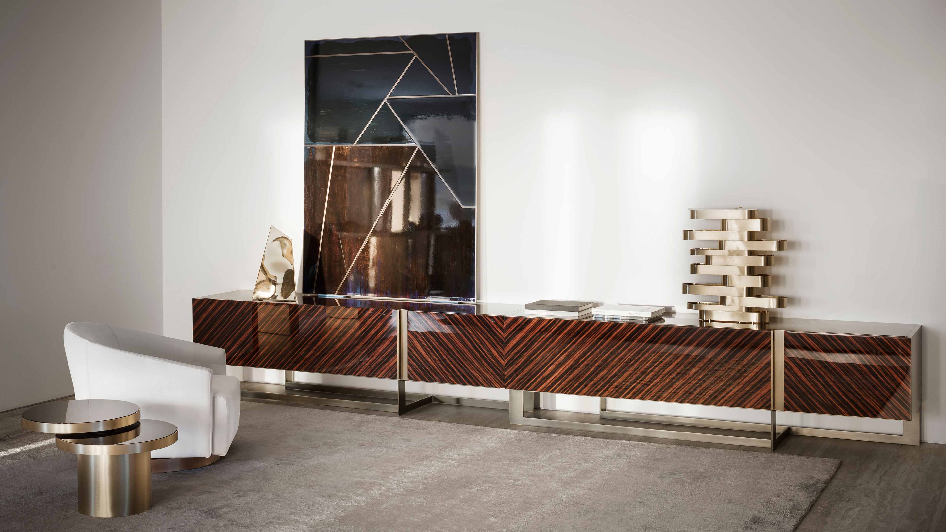 TV cabinet. Base finishes in bronze, chrome or black chrome. Structure in ebony or upholstered in leather, Doors in ebony, or upholstered in leather, or hand-painted.