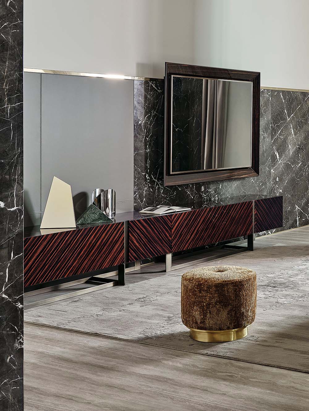 Rugiano’s selection of wood essences celebrates the organic beauty of wood through processes that enhance natural grain and color depth. Every piece becomes unique thanks to our master cabinetmakers, who transform raw materials into artistic surfaces.